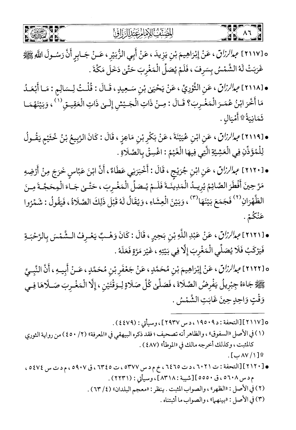 2122- عبد الرزاق، عَن إِبرَاهِيمَ بْنِ مُحَمَّدٍ، عَن جَعْفَرِ بْنِ مُحَمَّدٍ، عَنْ أَبِيهِ، أَنَّ النَّبِيَّ صَلَّى اللهُ عَلَيْهِ وَسَلَّمَ جَاءَهُ جِبْرِيلُ يَفْرِضُ الصَّلاَةَ، فَصَلَّى كُلَّ صَلاَةٍ لِوَقْتَيْنِ، إِلاَّ المَغْرِبَ صَلاَّهَا فِي وَقْتٍ وَاحِدٍ، حِينَ غَابَتِ الشَّمْسُ.
