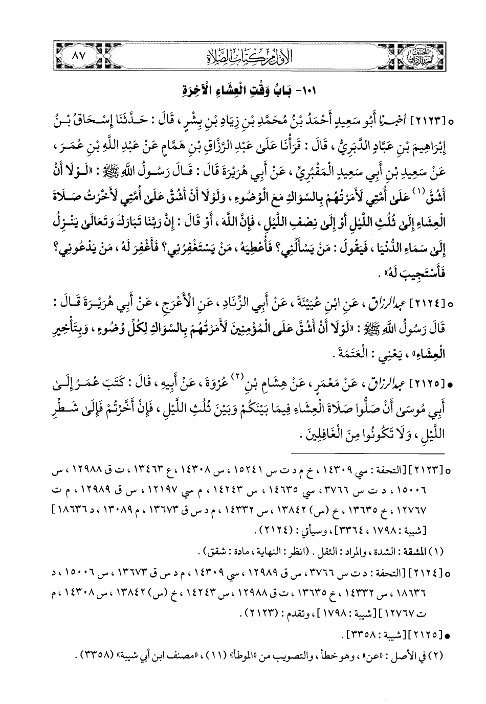 2124- عبد الرزاق، عَنِ ابْنِ عُيَيْنَةَ، عَنْ أَبِي الزِّنَادِ، عَنِ الأَعْرَجِ، عَنْ أَبِي هُرَيرَةَ، قَالَ: قَالَ رَسُولُ اللهِ صَلَّى اللهُ عَلَيْهِ وَسَلَّمَ: لَوْلاَ أَنْ أَشُقَّ عَلَى المُؤْمِنِينَ، لأَمَرْتُهُمْ بِالسِّوَاكِ لِكُلِّ وُضُوءٍ، وَبِتَأْخِيرِ الْعِشَاءِ، يَعْنِي الْعَتَمَةَ.