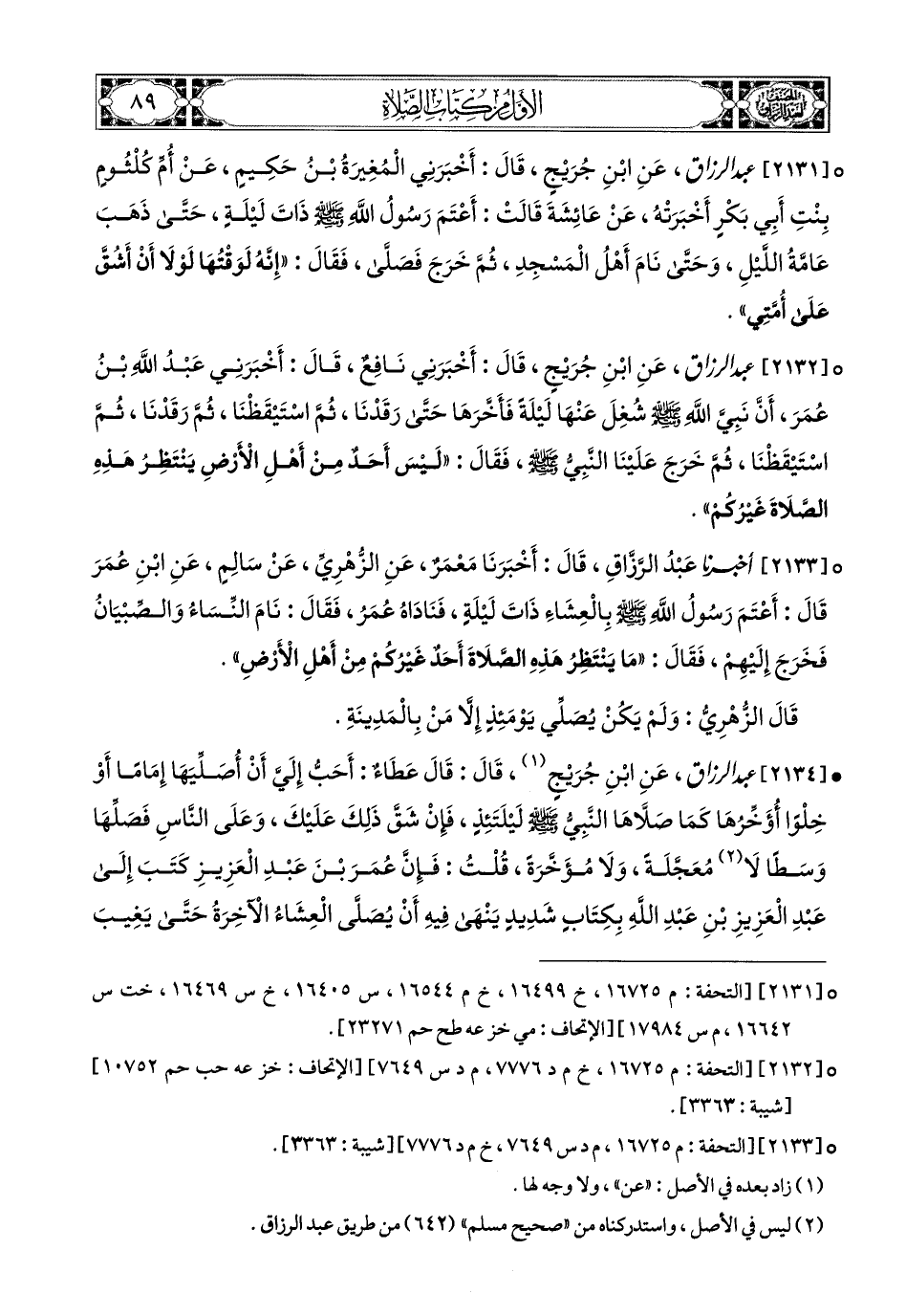 2133- أخبرنا عبد الرزاق، قَالَ: أَخْبَرَنَا مَعْمَرٌ، عَنِ الزُّهْرِيِّ، عَن سَالِمٍ، عَنِ ابْنِ عُمَرَ، قَالَ: أَعْتَمَ رَسُولُ اللهِ صَلَّى اللهُ عَلَيْهِ وَسَلَّمَ بِالْعِشَاءِ ذَاتَ لَيْلَةٍ، فَنَادَاهُ عُمَرُ فَقَالَ: نَامَ النِّسَاءُ وَالصِّبْيَانُ، فَخَرَجَ إِلَيْهِمْ فَقَالَ: مَا يَنْتَظِرُ هَذِهِ الصَّلاَةَ أَحَدٌ غَيْرُكُمْ مِنْ أَهْلِ الأَرْضِ.