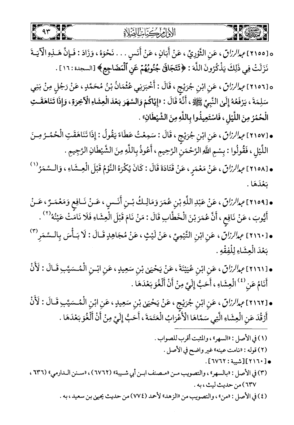 2161- عبد الرزاق، عَنِ ابْنِ عُيَيْنَةَ، عَن يَحيَى بنِ سَعيدٍ، عَنِ ابْنِ المُسَيَّبِ، قَالَ: لأَنْ أَنَامَ عَنِ الْعِشَاءِ، أَحَبُّ إِلَيَّ مِنْ أَنْ أَلْغُوَ بَعْدَهَا.