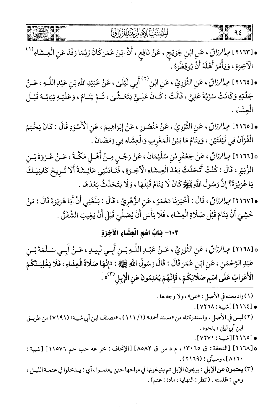 2168- عبد الرزاق، عَنِ الثَّورِيِّ، عَنْ عَبدِ اللهِ بْنِ أَبِي لَبِيدٍ، عَنْ أَبِي سَلَمَةَ بْنِ عَبدِ الرَّحْمَنِ، عَنِ ابْنِ عُمَرَ، قَالَ: قَالَ رَسُولُ اللهِ صَلَّى اللهُ عَلَيْهِ وَسَلَّمَ: إِنَّهَا صَلاَةُ الْعِشَاءِ، فَلاَ يَغْلِبَنَّكُمُ الأَعْرَابُ عَلَى اسْمِ صَلاَتِكُمْ، فَإِنَّهُمْ يُعْتِمُونَ عَنِ الإِبِلِ.