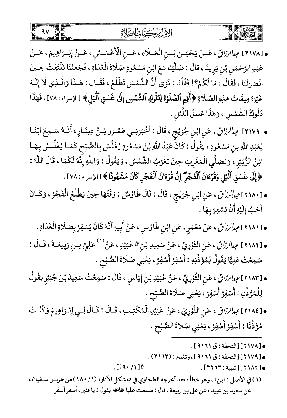 2181- عبد الرزاق، عَنْ مَعْمَرٍ، عَنِ ابْنِ طَاوُوسٍ، عَنْ أَبِيهِ؛ أَنَّهُ كَانَ يُسْفِرُ بِصَلاَةِ الْغَدَاةِ.