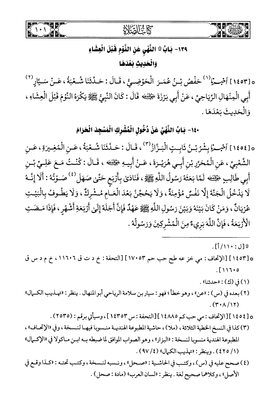 1453- أَخبَرَنا حَفْصُ بْنُ عُمَرَ الْحَوْضِيُّ, قَالَ: حَدَّثَنَا شُعْبَةُ, عَنْ سَيَّارٍ, أَبِي الْمِنْهَالِ الرِّيَاحِيِّ, عَنْ أَبِي بَرْزَةَ رَضِيَ اللهُ عَنْهُ, قَالَ: كَانَ النَّبِيُّ صَلى الله عَليهِ وسَلم يَكْرَهُ النَّوْمَ قَبْلَ الْعِشَاءِ, وَالْحَدِيثَ بَعْدَهَا.