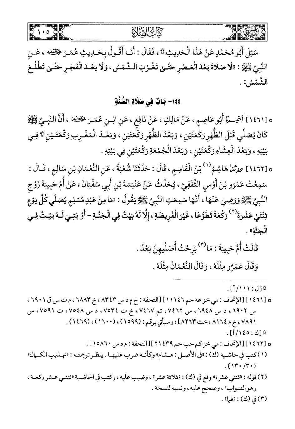 1461- أَخبَرَنا أَبُو عَاصِمٍ, عَنْ مَالِكٍ, عَنْ نَافِعٍ, عَنِ ابْنِ عُمَرَ رَضِيَ اللهُ عَنْهُمَا؛ أَنَّ النَّبِيَّ صَلى الله عَليهِ وسَلم كَانَ يُصَلِّي قَبْلَ الظُّهْرِ رَكْعَتَيْنِ, وَبَعْدَ الظُّهْرِ رَكْعَتَيْنِ, وَبَعْدَ الْمَغْرِبِ رَكْعَتَيْنِ فِي بَيْتِهِ, وَبَعْدَ الْعِشَاءِ رَكْعَتَيْنِ, وَبَعْدَ الْجُمُعَةِ رَكْعَتَيْنِ فِي بَيْتِهِ.
