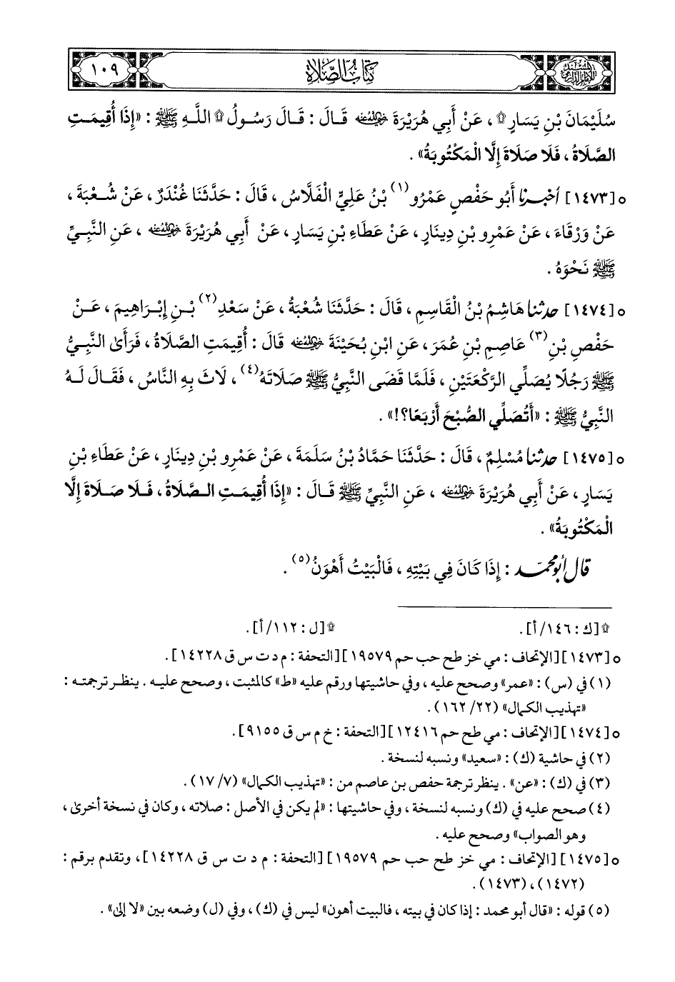 1475- حَدَّثَنَا مُسْلِمٌ, قَالَ: حَدَّثَنَا حَمَّادُ بْنُ سَلَمَةَ, عَنْ عَمْرِو بْنِ دِينَارٍ, عَنْ عَطَاءِ بْنِ يَسَارٍ, عَنْ أَبِي هُرَيْرَةَ رَضِيَ اللهُ عَنْهُ, عَنِ النَّبِيِّ صَلى الله عَليهِ وسَلم, قَالَ: إِذَا أُقِيمَتِ الصَّلاَةُ, فَلاَ صَلاَةَ إِلاَّ الْمَكْتُوبَةُ.