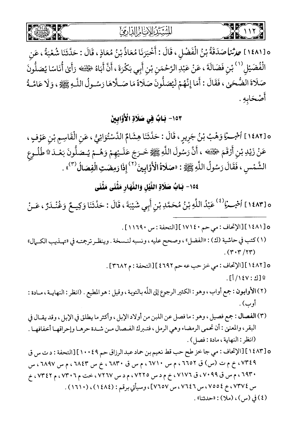 1482- أَخبَرَنا وَهْبُ بْنُ جَرِيرٍ, قَالَ: حَدَّثَنَا هِشَامٌ الدَّسْتُوَائِيُّ, عَنِ الْقَاسِمِ بْنِ عَوْفٍ, عَنْ زَيْدِ بْنِ أَرْقَمَ رَضِيَ اللهُ عَنْهُ, أَنَّ رَسُولَ اللهِ صَلى الله عَليهِ وسَلم خَرَجَ عَلَيْهِمْ وَهُمْ يُصَلُّونَ بَعْدَ طُلُوعِ الشَّمْسِ, فَقَالَ رَسُولُ اللهِ صَلى الله عَليهِ وسَلم: صَلاَةُ الأَوَّابِينَ إِذَا رَمِضَتِ الْفِصَالُ.