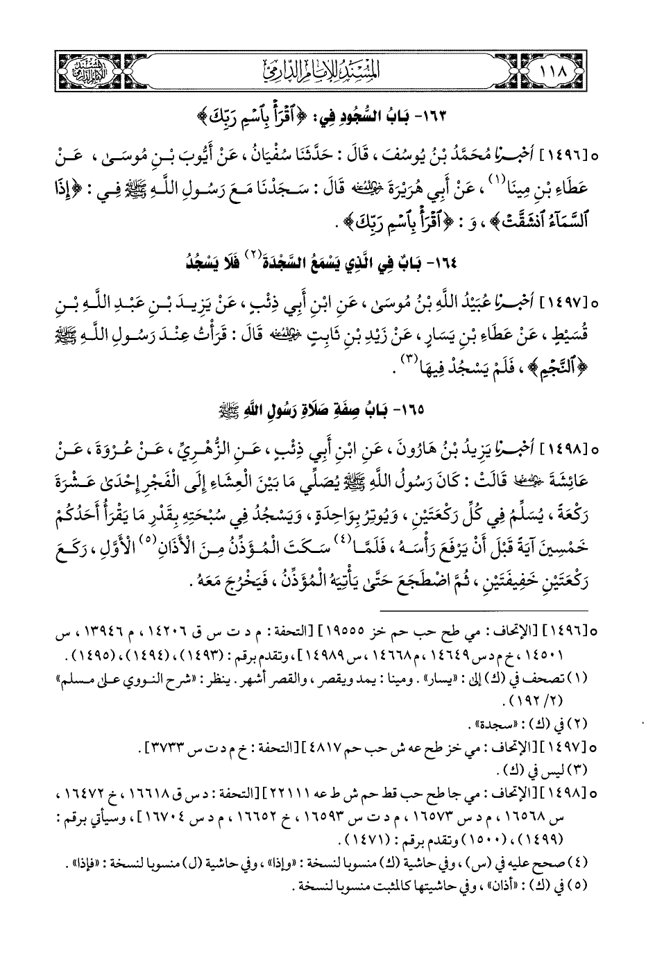 1497- أَخبَرَنا عُبَيْدُ اللهِ بْنُ مُوسَى, عَنِ ابْنِ أَبِي ذِئْبٍ, عَنْ يَزِيدَ بْنِ عَبْدِ اللهِ بْنِ قُسَيْطٍ, عَنْ عَطَاءِ بْنِ يَسَارٍ, عَنْ زَيْدِ بْنِ ثَابِتٍ رَضِيَ اللهُ عَنْهُ, قَالَ: قَرَأْتُ عِنْدَ رَسُولِ اللهِ صَلى الله عَليهِ وسَلم {النَّجْمَ} فَلَمْ يَسْجُدْ فِيهَا.