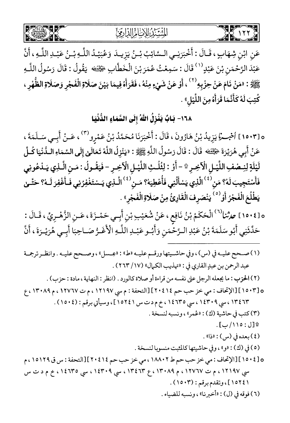 1503- أَخبَرَنا يَزِيدُ بْنُ هَارُونَ, قَالَ: أَخبَرَنا مُحَمَّدُ بْنُ عَمْرٍو, عَنْ أَبِي سَلَمَةَ, عَنْ أَبِي هُرَيْرَةَ رَضِيَ اللهُ عَنْهُ, قَالَ: قَالَ رَسُولُ اللهِ صَلى الله عَليهِ وسَلم: يَنْزِلُ اللهُ تَعَالَى إِلَى السَّمَاءِ الدُّنْيَا كُلَّ لَيْلَةٍ لِنِصْفِ اللَّيْلِ الآخِرِ, أَوْ لِثُلُثِ اللَّيْلِ الآخِرِ, فَيَقُولُ: مَنِ الَّذِي (1) يَدْعُونِي, فَأَسْتَجِيبَ لَهُ؟ مَنْ ذَا الَّذِي يَسْأَلُنِي فَأُعْطِيَهُ؟ مَنْ ذَا الَّذِي يَسْتَغْفِرُنِي فَأَغْفِرَ لَهُ؟ حَتَّى يَطْلُعَ الْفَجْرُ, أَوْ يَنْصَرِفَ الْقَارِئُ مِنْ صَلاَةِ الْفَجْرِ.