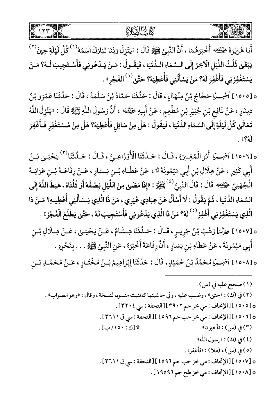 1506- أَخبَرَنا أَبُو الْمُغِيرَةِ, قَالَ: حَدَّثَنَا الأَوْزَاعِيُّ, قَالَ: حَدَّثَنَا يَحْيَى بْنُ أَبِي كَثِيرٍ, عَنْ هِلاَلِ بْنِ أَبِي مَيْمُونَةَ, عَنْ عَطَاءِ بْنِ يَسَارٍ, عَنْ رِفَاعَةَ بْنِ عَرَابَةَ الْجُهَنِيِّ رَضِيَ اللهُ عَنْهُ, قَالَ: قَالَ النَّبِيُّ صَلى الله عَليهِ وسَلم: إِذَا مَضَى مِنَ اللَّيْلِ نِصْفُهُ, أَوْ ثُلُثَاهُ, هَبَطَ اللهُ إِلَى السَّمَاءِ الدُّنْيَا, ثُمَّ يَقُولُ: لاَ أَسْأَلُ عَنْ عِبَادِي غَيْرِي, مَنْ ذَا الَّذِي يَسْأَلُنِي أُعْطِيهِ؟ مَنْ ذَا الَّذِي يَسْتَغْفِرُنِي أَغْفِرُ (1) لَهُ؟ مَنْ ذَا الَّذِي يَدْعُونِي, فَأَسْتَجِيبَ لَهُ؟ حَتَّى يَطْلُعَ الْفَجْرُ.