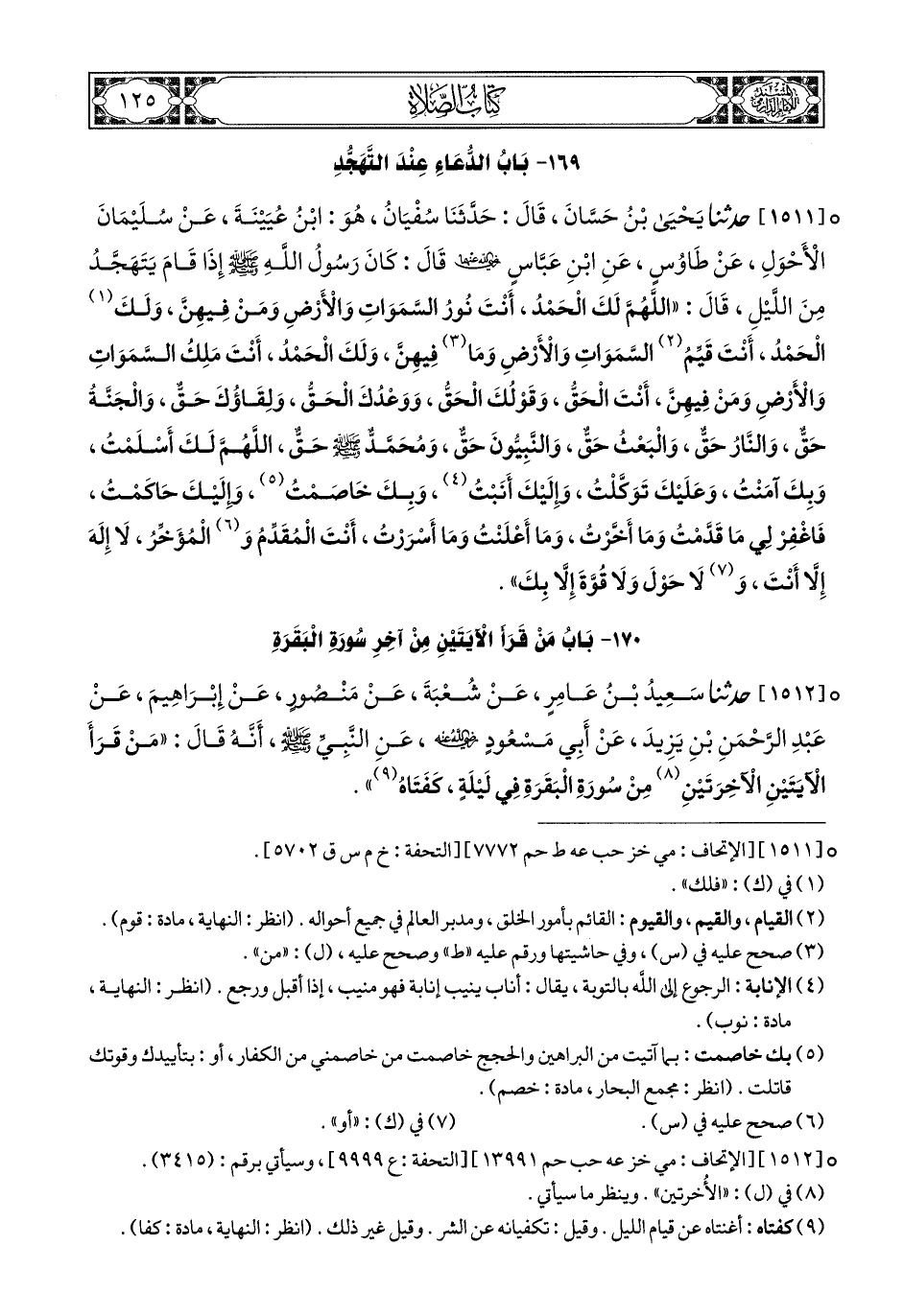 1511- حَدَّثَنَا يَحْيَى بْنُ حَسَّانَ, قَالَ: حَدَّثَنَا سُفْيَانُ, هُوَ ابْنُ عُيَيْنَةَ, عَنْ سُلَيْمَانَ الأَحْوَلِ, عَنْ طَاوُوسٍ, عَنِ ابْنِ عَبَّاسٍ رَضِيَ اللهُ عَنْهُمَا, قَالَ: كَانَ رَسُولُ اللهِ صَلى الله عَليهِ وسَلم إِذَا قَامَ يَتَهَجَّدُ مِنَ اللَّيْلِ, قَالَ: اللهُمَّ لَكَ الْحَمْدُ, أَنْتَ نُورُ السَّمَاوَاتِ وَالأَرْضِ, وَمَنْ فِيهِنَّ, وَلَكَ الْحَمْدُ, أَنْتَ قَيِّمُ السَّمَاوَاتِ وَالأَرْضِ, وَمَا (1) فِيهِنَّ, وَلَكَ الْحَمْدُ, أَنْتَ مَلِكُ السَّمَاوَاتِ وَالأَرْضِ, وَمَنْ فِيهِنَّ, أَنْتَ الْحَقُّ, وَقَوْلُكَ الْحَقُّ, وَوَعْدُكَ الْحَقُّ, وَلِقَاؤُكَ حَقٌّ, وَالْجَنَّةُ حَقٌّ, وَالنَّارُ حَقٌّ, وَالْبَعْثُ حَقٌّ, وَالنَّبِيِّونَ حَقٌّ, وَمُحَمَّدٌ صَلى الله عَليهِ وسَلم حَقٌّ, اللهُمَّ لَكَ أَسْلَمْتُ, وَبِكَ آمَنْتُ, وَعَلَيْكَ تَوَكَّلْتُ, وَإِلَيْكَ أَنَبْتُ وَبِكَ خَاصَمْتُ وَإِلَيْكَ حَاكَمْتُ, فَاغْفِرْ لِي مَا قَدَّمْتُ وَمَا أَخَّرْتُ وَمَا أَعْلَنْتُ وَمَا أَسْرَرْتُ أَنْتَ الْمُقَدِّمُ وَالْمُؤَخِّرُ (2) لاَ إِلَهَ إِلاَّ أَنْتَ, وَلاَ حَوْلَ, وَلاَ قُوَّةَ إِلاَّ بِكَ.