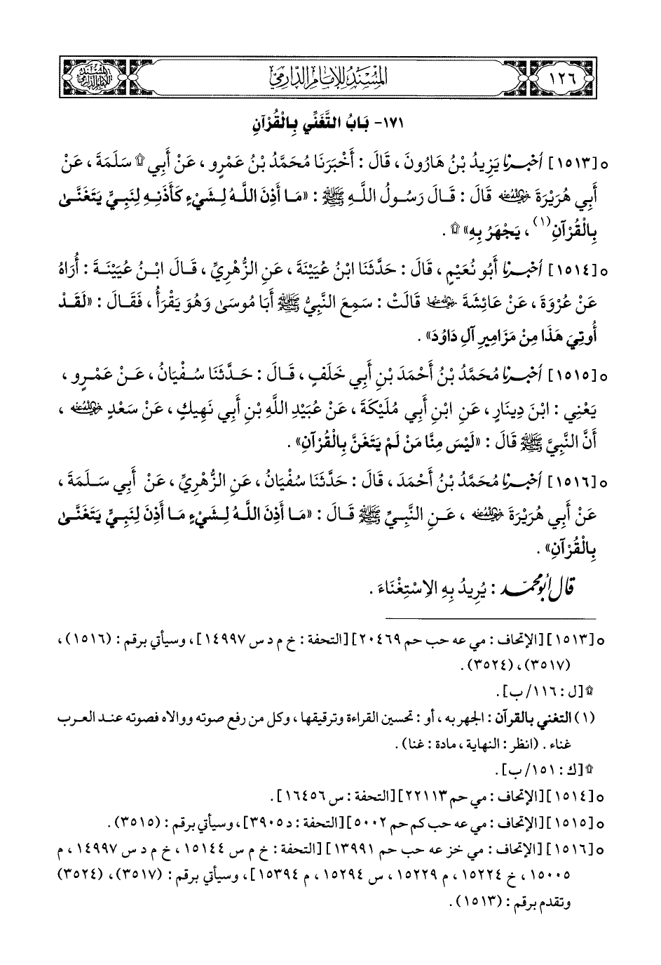 1516- أَخبَرَنا مُحَمَّدُ بْنُ أَحْمَدَ, قَالَ: حَدَّثَنَا سُفْيَانُ, عَنِ الزُّهْرِيِّ, عَنْ أَبِي سَلَمَةَ, عَنْ أَبِي هُرَيْرَةَ رَضِيَ اللهُ عَنْهُ, عَنِ النَّبِيِّ صَلى الله عَليهِ وسَلم, قَالَ: مَا أَذِنَ اللهُ لِشَيْءٍ مَا أَذِنَ لِنَبِيٍّ يَتَغَنَّى بِالْقُرْآنِ.