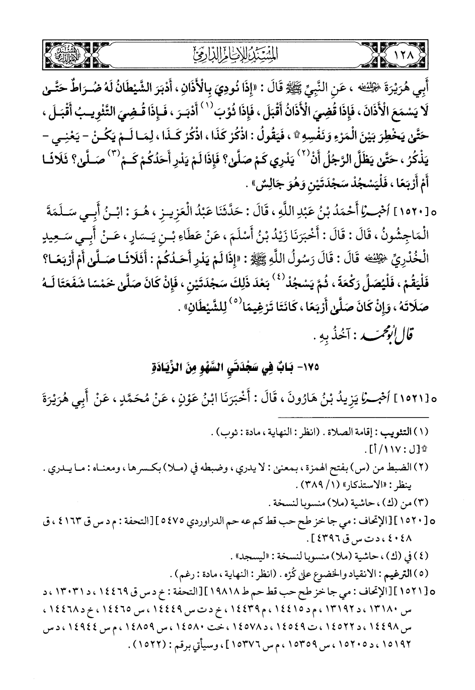 1520- أَخبَرَنا أَحْمَدُ بْنُ عَبْدِ اللهِ, قَالَ: حَدَّثَنَا عَبْدُ الْعَزِيزِ, هُوَ ابْنُ أَبِي سَلَمَةَ الْمَاجِشُونُ, قَالَ: قَالَ: أَخبَرَنا زَيْدُ بْنُ أَسْلَمَ, عَنْ عَطَاءِ بْنِ يَسَارٍ, عَنْ أَبِي سَعِيدٍ الْخُدْرِيِّ رَضِيَ اللهُ عَنْهُ, قَالَ: قَالَ رَسُولُ اللهِ صَلى الله عَليهِ وسَلم: إِذَا لَمْ يَدْرِ أَحَدُكُمْ أَثَلاَثًا صَلَّى أَمْ أَرْبَعًا, فَلْيَقُمْ فَلْيُصَلِّ رَكْعَةً, ثُمَّ يَسْجُدْ بَعْدَ ذَلِكَ سَجْدَتَيْنِ, فَإِنْ كَانَ صَلَّى خَمْسًا, شَفَعَتَا لَهُ صَلاَتَهُ, وَإِنْ كَانَ صَلَّى أَرْبَعًا, كَانَتَا تَرْغِيمًا لِلشَّيْطَانِ.