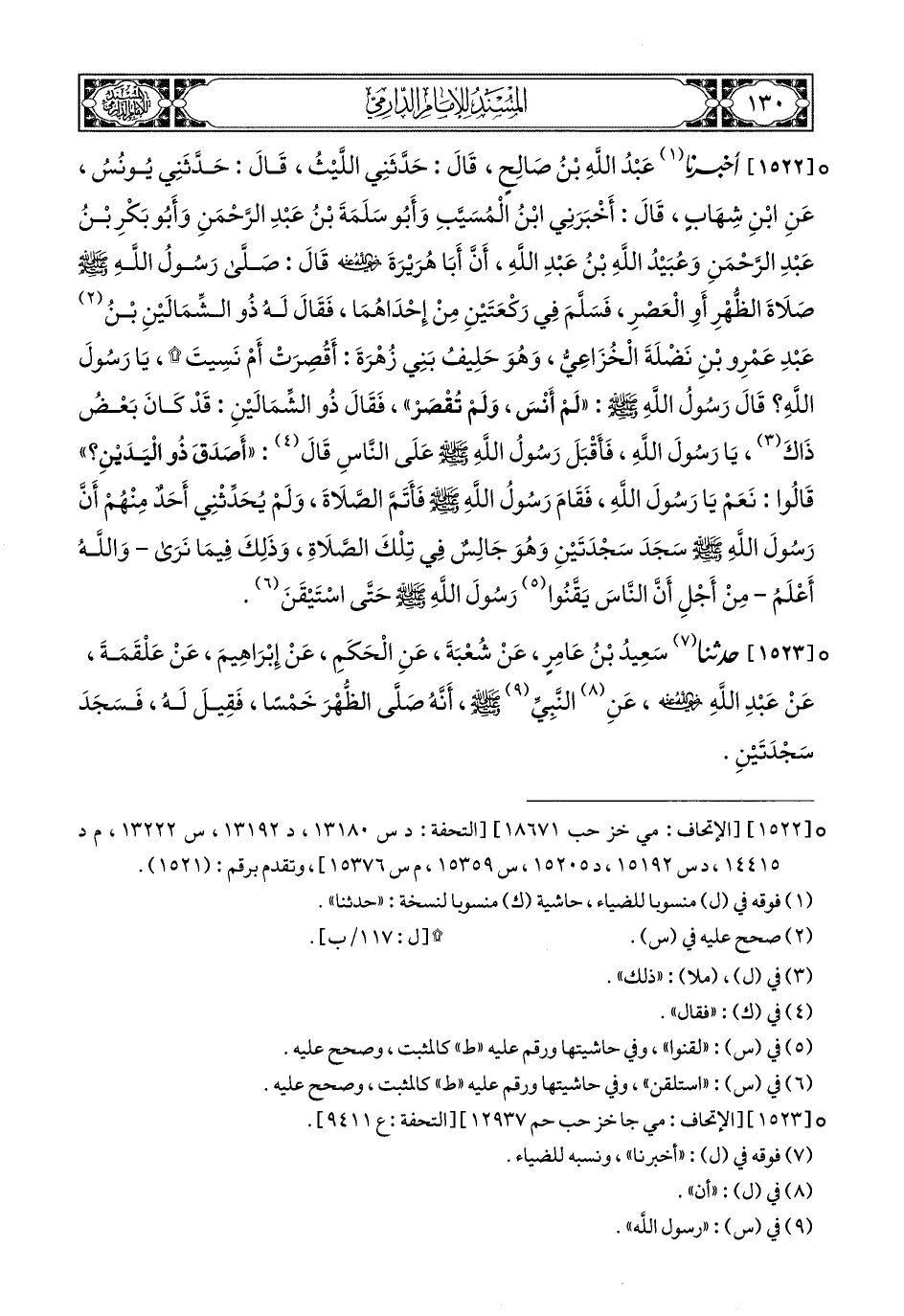 1522- أَخبَرَنا عَبْدُ اللهِ بْنُ صَالِحٍ, قَالَ: حَدَّثَنِي اللَّيْثُ, قَالَ: حَدَّثَنِي يُونُسُ, عَنِ ابْنِ شِهَابٍ, قَالَ: أَخبَرَنِي ابْنُ الْمُسَيَّبِ, وَأَبُو سَلَمَةَ بْنُ عَبْدِ الرَّحْمَنِ, وَأَبُو بَكْرِ بْنُ عَبْدِ الرَّحْمَنِ, وَعُبَيْدُ اللهِ بْنُ عَبْدِ اللهِ, أَنَّ أبا هُرَيْرَةَ رَضِيَ اللهُ عَنْهُ, قَالَ: صَلَّى رَسُولُ اللهِ صَلى الله عَليهِ وسَلم صَلاَةَ الظُّهْرِ, أَوِ الْعَصْرِ, فَسَلَّمَ فِي رَكْعَتَيْنِ مِنْ إِحْدَاهُمَا, فَقَالَ لَهُ ذُو الشِّمَالَيْنِ بْنُ عَبْدِ عَمْرِو بْنِ نَضْلَةَ الْخُزَاعِيُّ, وَهُوَ حَلِيفُ بَنِي زُهْرَةَ: أَقُصِرَتْ (1), أَمْ نَسِيتَ يَا رَسُولَ اللهِ, قَالَ رَسُولُ اللهِ صَلى الله عَليهِ وسَلم: لَمْ أَنْسَ, وَلَمْ تُقْصَرْ, فَقَالَ ذُو الشِّمَالَيْنِ: قَدْ كَانَ بَعْضُ ذَاكَ يَا رَسُولَ اللهِ, فَأَقْبَلَ رَسُولُ اللهِ صَلى الله عَليهِ وسَلم عَلَى النَّاسِ, قَالَ (2): أَصَدَقَ ذُو الْيَدَيْنِ؟ قَالُوا: نَعَمْ, يَا رَسُولَ اللهِ, فَقَامَ رَسُولُ اللهِ صَلى الله عَليهِ وسَلم, فَأَتَمَّ الصَّلاَةَ, وَلَمْ يُحَدِّثْنِي أَحَدٌ مِنْهُمْ أَنَّ رَسُولَ اللهِ صَلى الله عَليهِ وسَلم سَجَدَ سَجْدَتَيْنِ وَهُوَ جَالِسٌ فِي تِلْكَ الصَّلاَةِ, وَذَلِكَ فِيمَا نَرَى وَاللهُ أَعْلَمُ مِنْ أَجْلِ أَنَّ النَّاسَ يَقَّنُوا رَسُولَ اللهِ صَلى الله عَليهِ وسَلم, حَتَّى اسْتَيْقَنَ.
