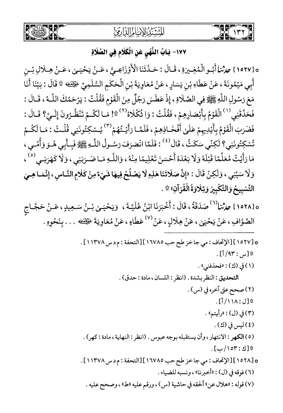 1527- حَدَّثَنَا أَبُو الْمُغِيرَةِ, قَالَ: حَدَّثَنَا الأَوْزَاعِيُّ, عَنْ يَحْيَى, عَنْ هِلاَلِ بْنِ أَبِي مَيْمُونَةَ, عَنْ عَطَاءِ بْنِ يَسَارٍ, عَنْ مُعَاوِيَةَ بْنِ الْحَكَمِ السُّلَمِيِّ رَضِيَ اللهُ عَنْهُ, قَالَ: بَيْنَا أَنَا مَعَ رَسُولِ اللهِ صَلى الله عَليهِ وسَلم فِي الصَّلاَةِ, إِذْ عَطَسَ رَجُلٌ مِنَ الْقَوْمِ, فَقُلْتُ: يَرْحَمُكَ اللهُ, قَالَ: فَحَدَّقَنِي الْقَوْمُ بِأَبْصَارِهِمْ, فَقُلْتُ: وَاثُكْلاَهُ, مَا لَكُمْ تَنْظُرُونَ إِلَيَّ؟ قَالَ: فَضَرَبَ الْقَوْمُ بِأَيْدِيهِمْ عَلَى أَفْخَاذِهِمْ, فَلَمَّا رَأَيْتُهُمْ يُسَكِّتُونَنِي (1), قُلْتُ: مَا لَكُمْ تُسَكِّتُونَنِي, لَكِنِّي سَكَتُّ, قَالَ: فَلَمَّا انْصَرَفَ رَسُولُ اللهِ صَلى الله عَليهِ وسَلم, فَبِأَبِي هُوَ وَأُمِّي مَا رَأَيْتُ مُعَلِّمًا قَبْلَهُ, وَلاَ بَعْدَهُ أَحْسَنَ تَعْلِيمًا مِنْهُ, وَاللهِ مَا ضَرَبَنِي, وَلاَ كَهَرَنِي, وَلاَ سَبَّنِي, وَلَكِنْ قَالَ: إِنَّ صَلاَتَنَا هَذِهِ لاَ يَصْلُحُ فِيهَا شَيْءٌ مِنْ كَلاَمِ النَّاسِ, إِنَّمَا هِيَ التَّسْبِيحُ وَالتَّكْبِيرُ وَتِلاَوَةُ الْقُرْآنِ.