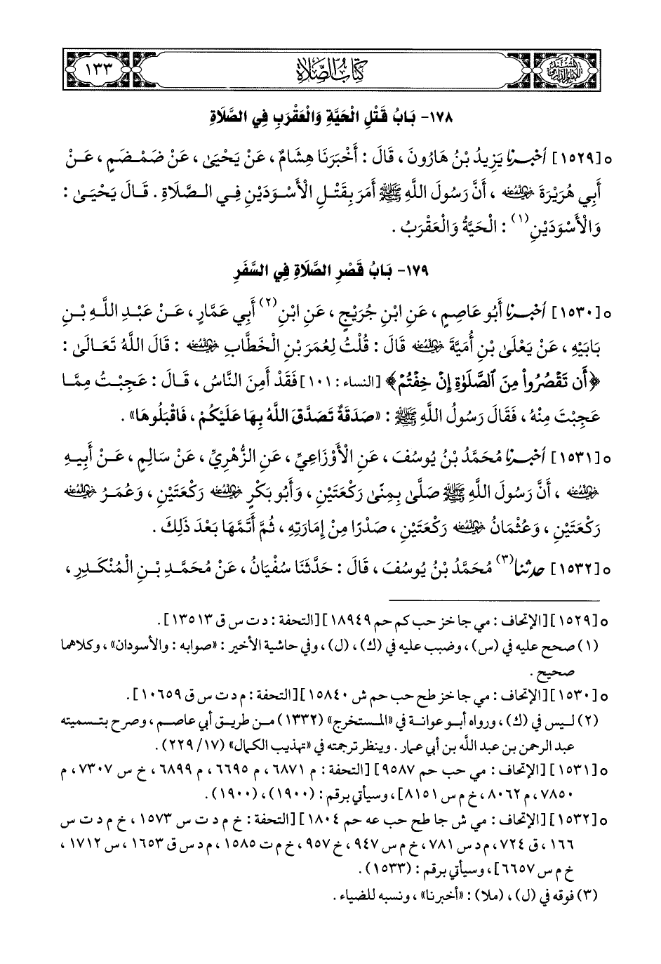 1529- أَخبَرَنا يَزِيدُ بْنُ هَارُونَ, قَالَ: أَخبَرَنا هِشَامٌ, عَنْ يَحْيَى, عَنْ ضَمْضَمٍ, عَنْ أَبِي هُرَيْرَةَ رَضِيَ اللهُ عَنْهُ, أَنَّ رَسُولَ اللهِ صَلى الله عَليهِ وسَلم أَمَرَ بِقَتْلِ الأَسْوَدَيْنِ فِي الصَّلاَةِ.