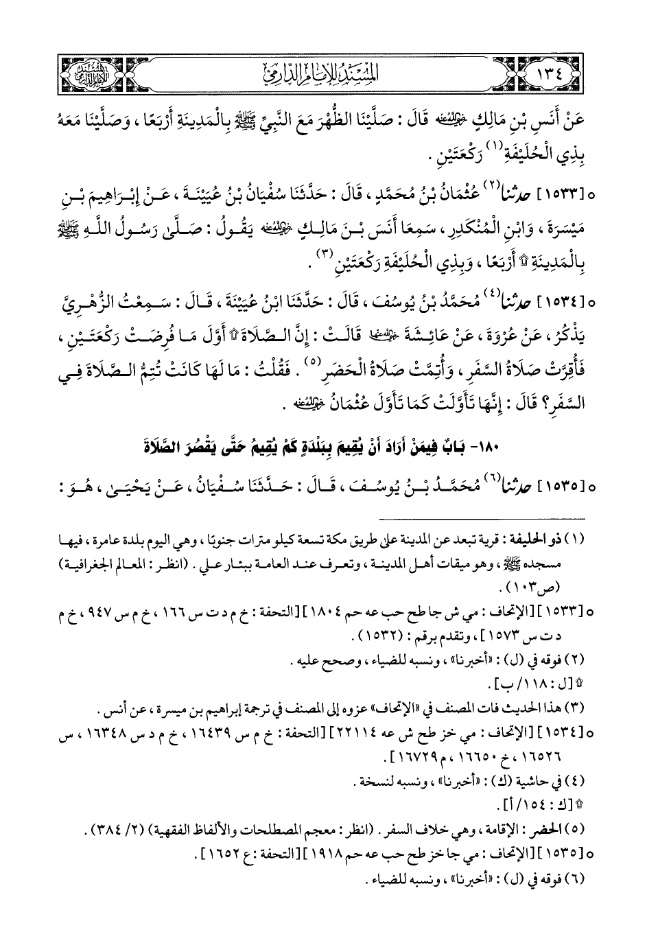 1533- حَدَّثَنَا عُثْمَانُ بْنُ مُحَمَّدٍ, قَالَ: حَدَّثَنَا سُفْيَانُ بْنُ عُيَيْنَةَ, عَنْ إِبْرَاهِيمَ بْنِ مَيْسَرَةَ, وَابْن الْمُنْكَدِرِ, سَمِعَا أَنَسَ بْنَ مَالِكٍ رَضِيَ اللهُ عَنْهُ يَقُولُ: صَلَّى رَسُولُ اللهِ صَلى الله عَليهِ وسَلم بِالْمَدِينَةِ أَرْبَعًا, وَبِذِي الْحُلَيْفَةِ رَكْعَتَيْنِ.