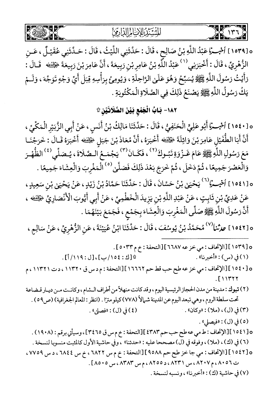 1540- أَخبَرَنا أَبُو عَلِيٍّ الْحَنَفِيُّ, قَالَ: حَدَّثَنَا مَالِكُ بْنُ أَنَسٍ, عَنْ أَبِي الزُّبَيْرِ الْمَكِّيِّ, أَنَّ أَبَا الطُّفَيْلِ عَامِرَ بْنَ وَاثِلَةَ رَضِيَ اللهُ عَنْهُ أَخْبَرَهُ, أَنَّ مُعَاذَ بْنَ جَبَلٍ رَضِيَ اللهُ عَنْهُ أَخْبَرَهُ, قَالَ: خَرَجْنَا مَعَ رَسُولِ اللهِ صَلى الله عَليهِ وسَلم عَامَ غَزْوَةِ تَبُوكَ, فَكَانَ يَجْمَعُ الصَّلاَةَ, يُصَلِّي (1) الظُّهْرَ وَالْعَصْرَ جَمِيعًا, ثُمَّ دَخَلَ, ثُمَّ خَرَجَ بَعْدَ ذَلِكَ, فَصَلَّى الْمَغْرِبَ وَالْعِشَاءَ جَمِيعًا.