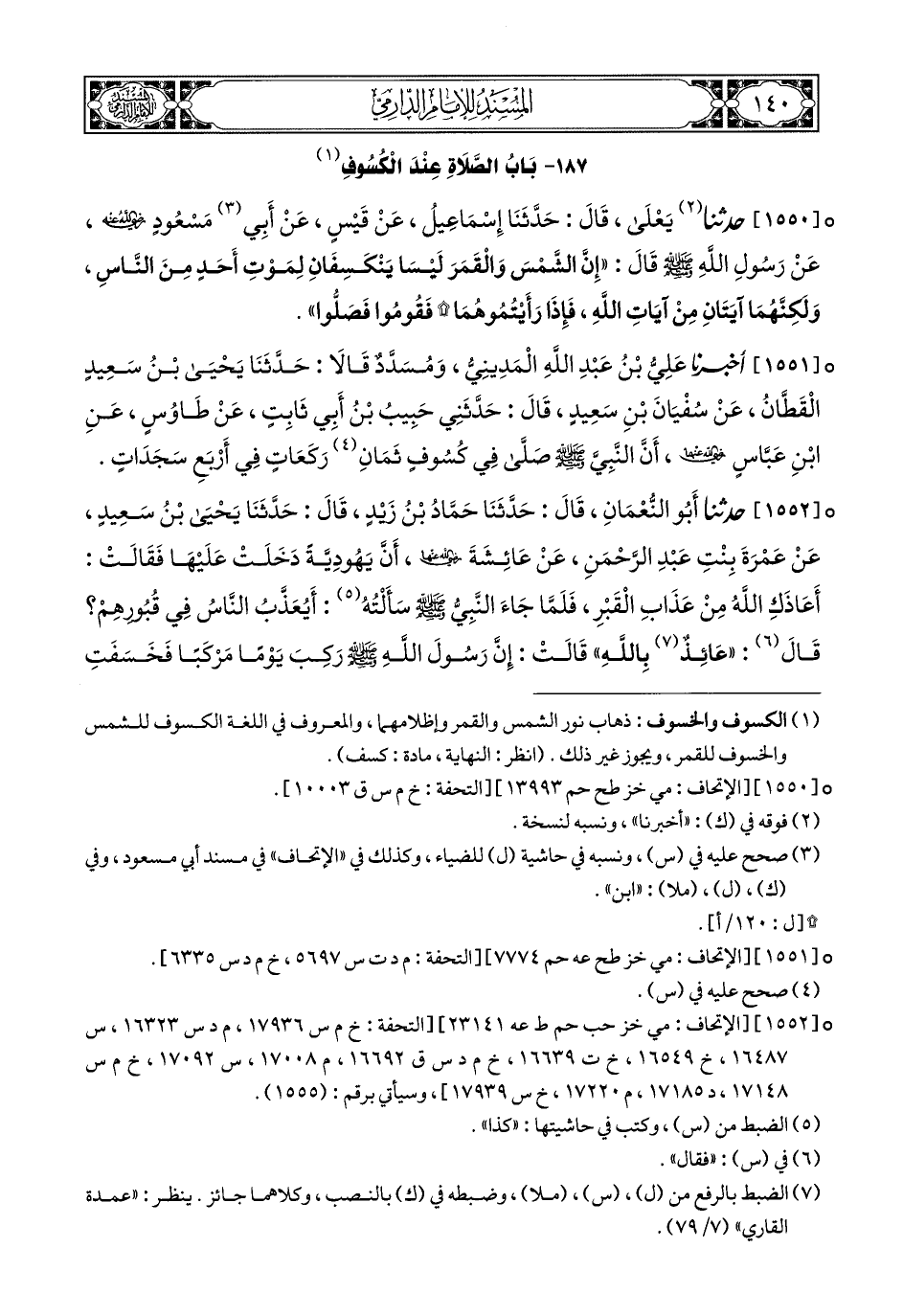 1551- أَخبَرَنا عَلِيُّ بْنُ عَبْدِ اللهِ الْمَدِينِيُّ, وَمُسَدَّدٌ, قَالاَ (1): حَدَّثَنَا يَحْيَى بْنُ سَعِيدٍ الْقَطَّانُ, عَنْ سُفْيَانَ بْنِ سَعِيدٍ, قَالَ: حَدَّثَنِي حَبِيبُ بْنُ أَبِي ثَابِتٍ, عَنْ طَاوُوسٍ, عَنِ ابْنِ عَبَّاسٍ رَضِيَ اللهُ عَنْهُمَا, أَنَّ النَّبِيَّ صَلى الله عَليهِ وسَلم صَلَّى فِي كُسُوفٍ ثَمَانَ رَكَعَاتٍ, فِي أَرْبَعِ سَجَدَاتٍ.