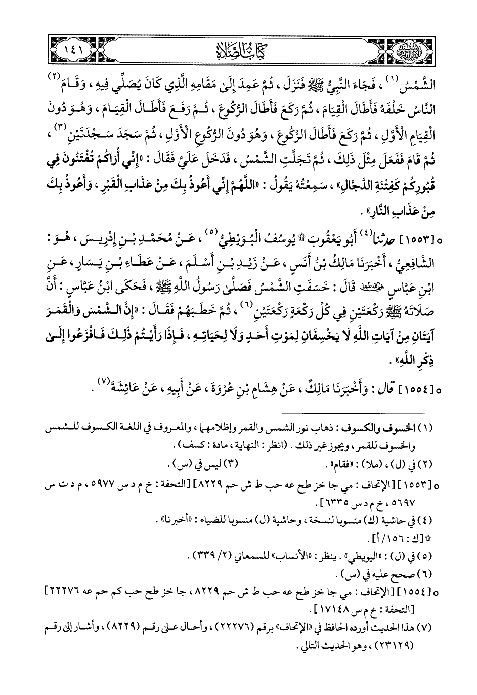 1553- حَدَّثَنَا أَبُو يَعْقُوبَ يُوسُفُ الْبُوَيْطِيُّ, عَنْ مُحَمَّدِ بْنِ إِدْرِيسَ, هُوَ (1) الشَّافِعِيُّ, أَخبَرَنا مَالِكُ بْنُ أَنَسٍ, عَنْ زَيْدِ بْنِ أَسْلَمَ, عَنْ عَطَاءِ بْنِ يَسَارٍ, عَنِ ابْنِ عَبَّاسٍ رَضِيَ اللهُ عَنْهُمَا, قَالَ: خَسَفَتِ الشَّمْسُ, فَصَلَّى رَسُولُ اللهِ صَلى الله عَليهِ وسَلم, فَحَكَى ابْنُ عَبَّاسٍ, أَنَّ صَلاَتَهُ صَلى الله عَليهِ وسَلم رَكْعَتَيْنِ, فِي كُلِّ رَكْعَةٍ رَكْعَتَيْنِ, ثُمَّ خَطَبَهُمْ, فَقَالَ: إِنَّ الشَّمْسَ وَالْقَمَرَ آيَتَانِ مِنْ آيَاتِ اللهِ لاَ يَخْسِفَانِ لِمَوْتِ أَحَدٍ, وَلاَ لِحَيَاتِهِ, فَإِذَا رَأَيْتُمْ ذَلِكَ, فَافْزَعُوا إِلَى ذكر اللهِ.