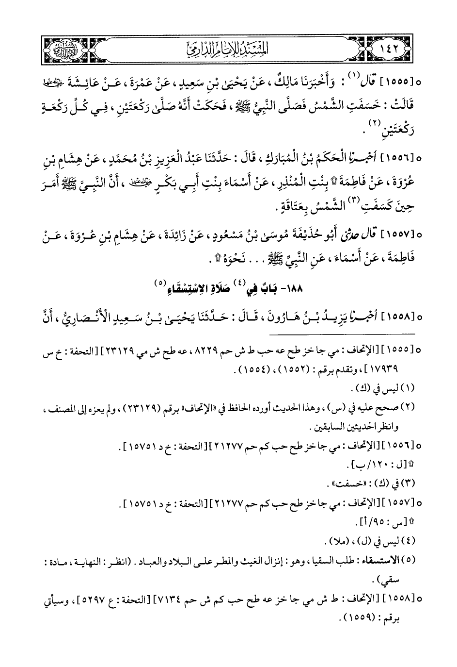 1555- قَالَ: وَأَخبَرَنا (1) مَالِكٌ, عَنْ يَحْيَى بْنِ سَعِيدٍ, عَنْ عَمْرَةَ, عَنْ عَائِشَةَ رَضِيَ اللهُ عَنْهَا, قَالَتْ: خَسَفَتِ الشَّمْسُ, فَصَلَّى النَّبِيُّ صَلى الله عَليهِ وسَلم, فَحَكَتْ أَنَّهُ صَلَّى رَكْعَتَيْنِ فِي كُلِّ رَكْعَةٍ رَكْعَتَيْنِ (2).