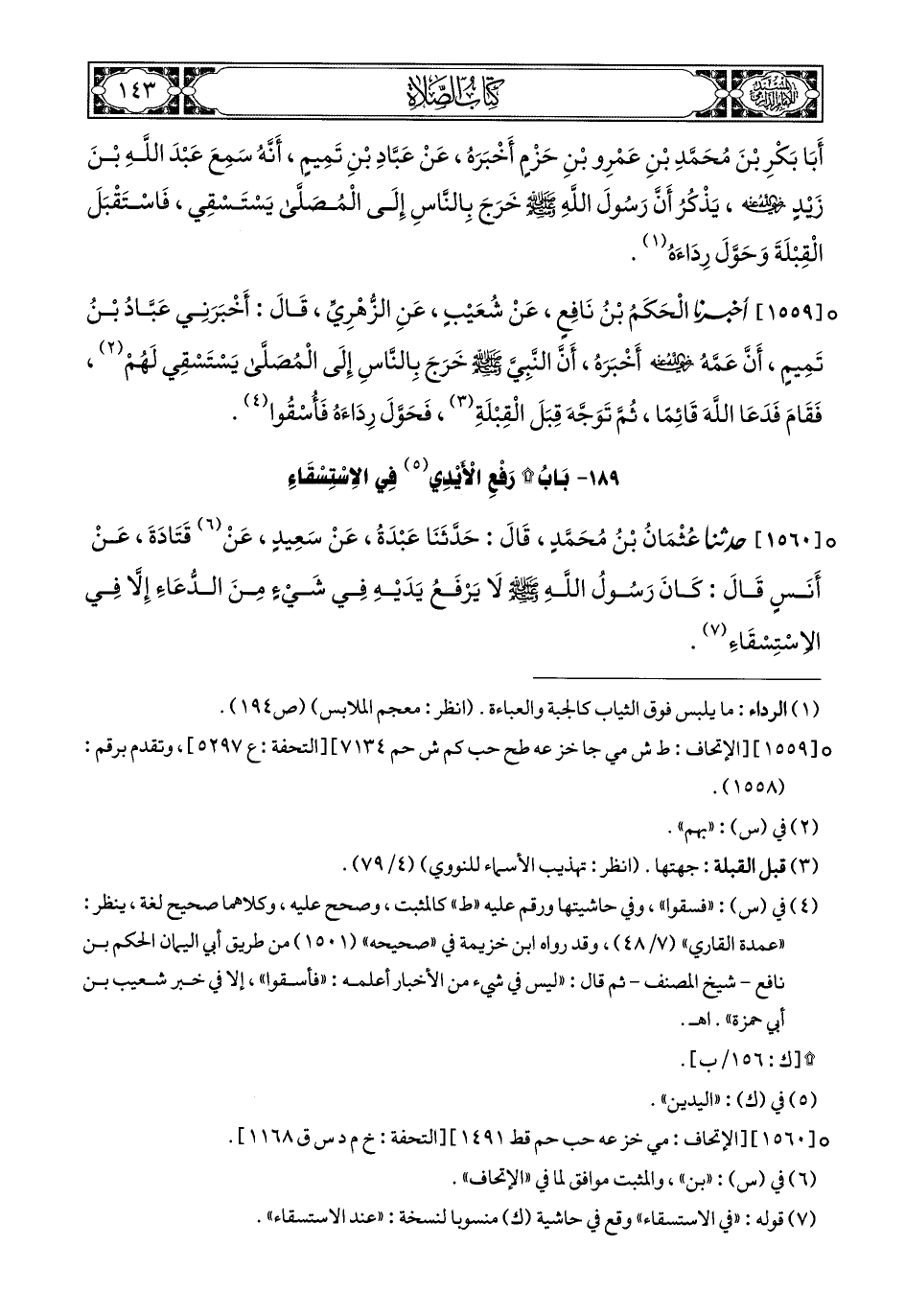 1559- أَخبَرَنا الْحَكَمُ بْنُ نَافِعٍ, عَنْ شُعَيْبٍ, عَنِ الزُّهْرِيِّ, قَالَ: أَخبَرَنِي عَبَّادُ بْنُ تَمِيمٍ, أَنَّ عَمَّهُ رَضِيَ اللهُ عَنْهُ أَخْبَرَهُ, أَنَّ النَّبِيَّ صَلى الله عَليهِ وسَلم خَرَجَ بِالنَّاسِ إِلَى الْمُصَلَّى, يَسْتَسْقِي لَهُمْ, فَقَامَ, فَدَعَا اللهَ قَائِمًا, ثُمَّ تَوَجَّهَ قِبَلَ الْقِبْلَةِ, فَحَوَّلَ رِدَاءَهُ, فَأُسْقُوا.