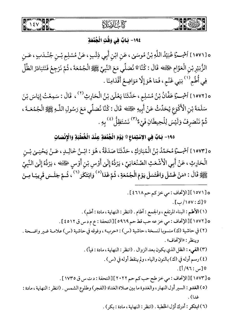 1571- أَخبَرَنا عُبَيْدُ اللهِ بْنُ مُوسَى, عَنِ ابْنِ أَبِي ذِئْبٍ, عَنْ مُسْلِمِ بْنِ جُنْدُبٍ, عَنِ الزُّبَيْرِ بْنِ الْعَوَّامِ رَضِيَ اللهُ عَنْهُ, قَالَ: كُنَّا نُصَلِّي مَعَ النَّبِيِّ صَلى الله عَليهِ وسَلم الْجُمُعَةَ, ثُمَّ نَرْجِعُ فَنتَبَادَرُ الظِّلَّ فِي أُطُمِ بَنِي غَنْمٍ, فَمَا هُوَ إِلاَّ مَوَاضِعُ أَقْدَامِنَا.