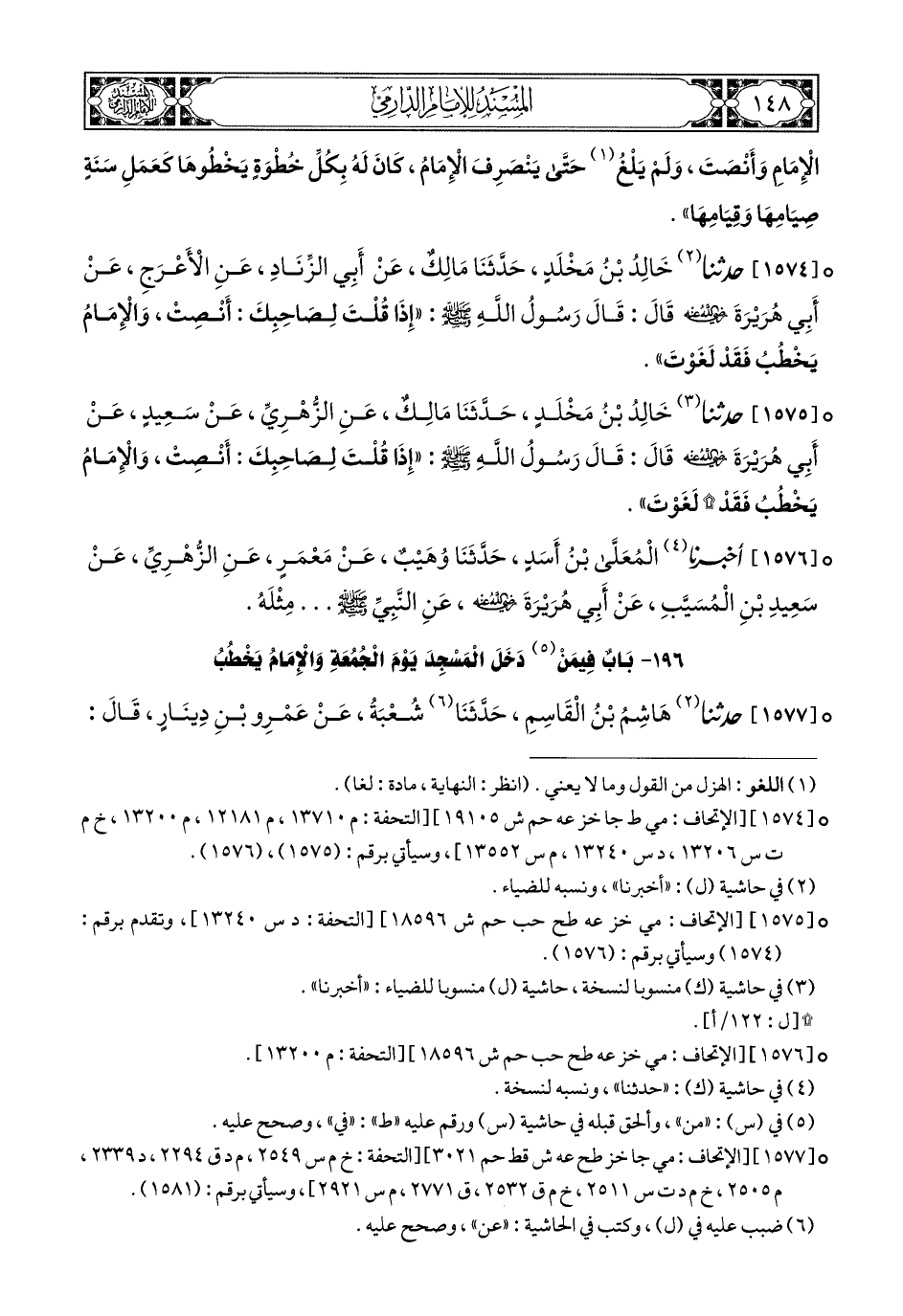 1574- حَدَّثَنَا خَالِدُ بْنُ مَخْلَدٍ, حَدَّثَنَا مَالِكٌ, عَنْ أَبِي الزِّنَادِ, عَنِ الأَعْرَجِ, عَنْ أَبِي هُرَيْرَةَ رَضِيَ اللهُ عَنْهُ, قَالَ: قَالَ رَسُولُ اللهِ صَلى الله عَليهِ وسَلم: إِذَا قُلْتَ لِصَاحِبِكَ أَنْصِتْ وَالإِمَامُ يَخْطُبُ فَقَدْ لَغَوْتَ.