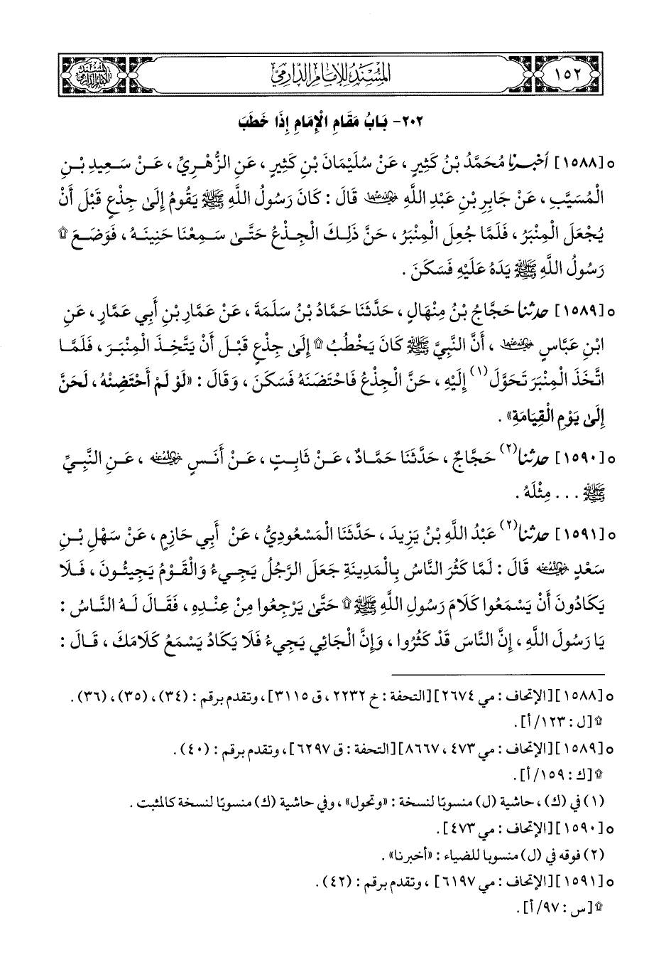 1591- حَدَّثَنَا عَبْدُ اللهِ بْنُ يَزِيدَ, حَدَّثَنَا الْمَسْعُودِيُّ, عَنْ أَبِي حَازِمٍ, عَنْ سَهْلِ بْنِ سَعْدٍ رَضِيَ اللهُ عَنْهُ, قَالَ: لَمَّا كَثُرَ النَّاسُ بِالْمَدِينَةِ, جَعَلَ الرَّجُلُ يَجِيءُ, وَالْقَوْمُ يَجِيؤُونَ, فَلاَ يَكَادُونَ أَنْ يَسْمَعُوا (1) كَلاَمَ رَسُولِ اللهِ صَلى الله عَليهِ وسَلم, حَتَّى يَرْجِعُوا مِنْ عِنْدِهِ, فَقَالَ لَهُ النَّاسُ: يَا رَسُولَ اللهِ, إِنَّ النَّاسَ قَدْ كَثُرُوا, وَإِنَّ الْجَائِيَ يَجِيءُ, فَلاَ يَكَادُ يَسْمَعُ كَلاَمَكَ, قَالَ: فَمَا شِئْتُمْ, فَأَرْسَلَ إِلَى غُلاَمٍ لاَمْرَأَةٍ مِنَ الأَنْصَارِ نَجَّارٍ, وَإِلَى طَرْفَاءِ الْغَابَةِ (2), فَجَعَلُوا لَهُ مِرْقَاتَيْنِ, أَوْ ثَلاَثَةً, فَكَانَ رَسُولُ اللهِ صَلى الله عَليهِ وسَلم يَجْلِسُ عَلَيْهِ, وَيَخْطُبُ عَلَيْهِ, فَلَمَّا فَعَلُوا ذَلِكَ, حَنَّتِ الْخَشَبَةُ الَّتِي كَانَ يَقُومُ عِنْدَهَا, فَقَامَ رَسُولُ اللهِ صَلى الله عَليهِ وسَلم إِلَيْهَا, فَوَضَعَ يَدَهُ عَلَيْهَا, فَسَكَنَتْ.