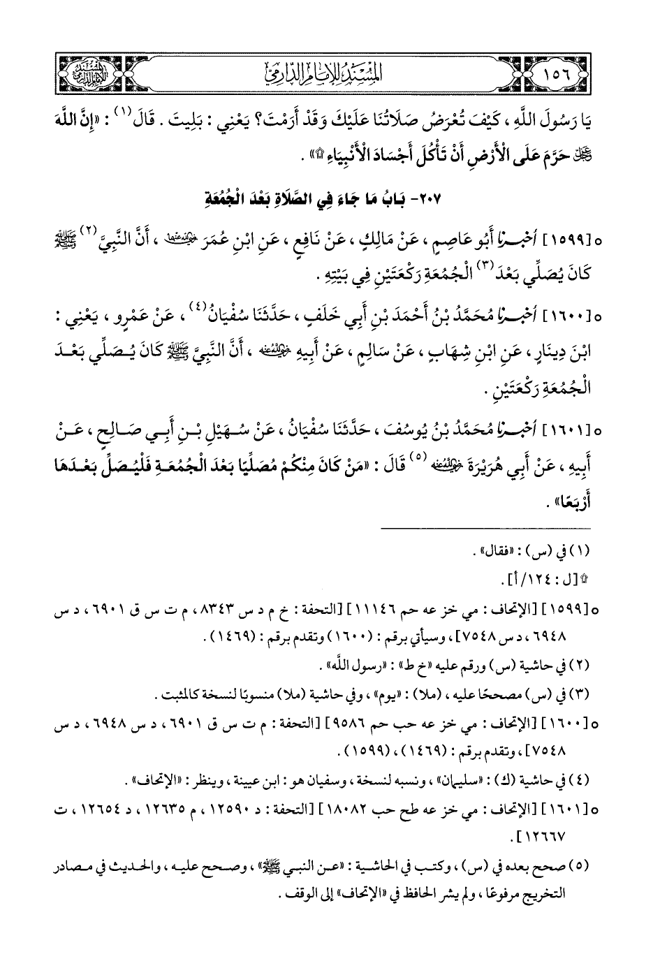 1599- أَخبَرَنا أَبُو عَاصِمٍ, عَنْ مَالِكٍ, عَنْ نَافِعٍ, عَنِ ابْنِ عُمَرَ رَضِيَ اللهُ عَنْهُمَا؛ أَنَّ النَّبِيَّ صَلى الله عَليهِ وسَلم كَانَ يُصَلِّي بَعْدَ الْجُمُعَةِ رَكْعَتَيْنِ فِي بَيْتِهِ.