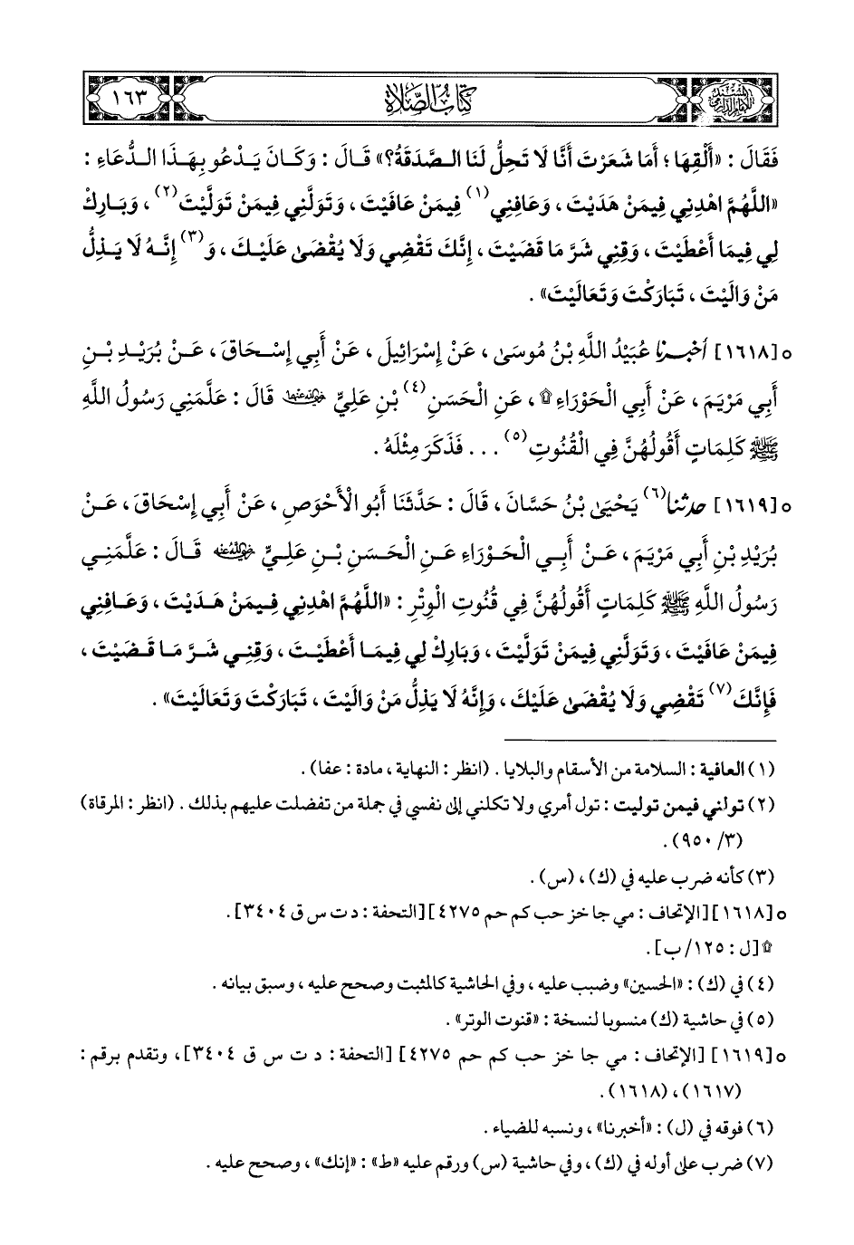 1619- حَدَّثَنَا يَحْيَى بْنُ حَسَّانَ, قال: حَدَّثَنَا أَبُو الأَحْوَصِ, عَنْ أَبِي إِسْحَاقَ, عَنْ بُرَيْدِ بْنِ أَبِي مَرْيَمَ, عَنْ أَبِي الْحَوْرَاءِ, عَنِ الْحَسَنِ بْنِ عَلِيٍّ رَضِيَ اللهُ عَنْهُ, قَالَ: عَلَّمَنِي رَسُولُ اللهِ صَلى الله عَليهِ وسَلم كَلِمَاتٍ أَقُولُهُنَّ فِي قُنُوتِ الْوِتْرِ, اللهُمَّ: اهْدِنِي فِيمَنْ هَدَيْتَ, وَعَافِنِي فِيمَنْ عَافَيْتَ, وَتَوَلَّنِي فِيمَنْ تَوَلَّيْتَ وَبَارِكْ لِي فِيمَا أَعْطَيْتَ, وَقِنِي شَرَّ مَا قَضَيْتَ فَإِنَّكَ تَقْضِي وَلاَ يُقْضَى عَلَيْكَ وَإِنَّهُ لاَ يَذِلُّ مَنْ وَالَيْتَ تَبَارَكْتَ وَتَعَالَيْتَ.