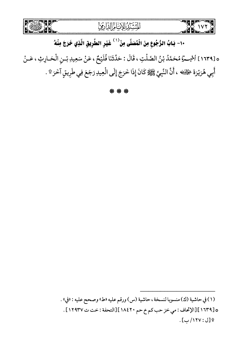 1639- أَخبَرَنا مُحَمَّدُ بْنُ الصَّلْتِ, قَالَ: حَدَّثَنَا فُلَيْحٌ, عَنْ سَعِيدِ بْنِ الْحَارِثِ, عَنْ أَبِي هُرَيْرَةَ رَضِيَ اللهُ عَنْهُ, أَنَّ النَّبِيَّ صَلى الله عَليهِ وسَلم كَانَ إِذَا خَرَجَ إِلَى الْعِيدِ, رَجَعَ فِي طَرِيقٍ آخَرَ.