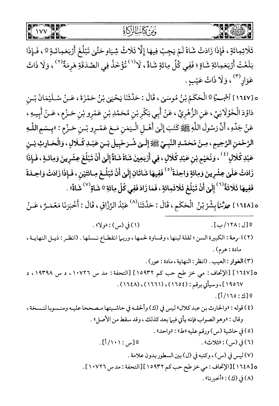1647- أَخبَرَنا الْحَكَمُ بْنُ مُوسَى, قَالَ: حَدَّثَنَا يَحْيَى بْنُ حَمْزَةَ, عَنْ سُلَيْمَانَ بْنِ دَاوُدَ الْخَوْلاَنِيِّ, عَنِ الزُّهْرِيِّ, عَنْ أَبِي بَكْرِ بْنِ مُحَمَّدِ بْنِ عَمْرِو بْنِ حَزْمٍ, عَنْ أَبِيهِ, عَنْ جَدِّهِ, أَنَّ رَسُولَ اللهِ صَلى الله عَليهِ وسَلم كَتَبَ إِلَى أَهْلِ الْيَمَنِ مَعَ عَمْرِو بْنِ حَزْمٍ: بِسْمِ اللهِ الرَّحْمَنِ الرَّحِيمِ, مِنْ مُحَمَّدٍ النَّبِيِّ صَلى الله عَليهِ وسَلم, إِلَى شُرَحْبِيلَ بْنِ عَبْدِ كُلاَلٍ, وَالْحَارِثِ بْنِ عَبْدِ كُلاَلٍ, وَنُعَيْمِ بْنِ عَبْدِ كُلاَلٍ فِي أَرْبَعِينَ شَاةً شَاةٌ, إِلَى أَنْ تَبْلُغَ عِشْرِينَ وَمِئَةً, فَإِذَا زَادَتْ عَلَى عِشْرِينَ وَمِئَةٍ وَاحِدَةً, فَفِيهَا شَاتَانِ إِلَى أَنْ تَبْلُغَ مِئَتَيْنِ, فَإِذَا زَادَتْ وَاحِدَةً, فَفِيهَا ثَلاَثَةٌ إِلَى أَنْ تَبْلُغَ ثَلاَثَ مِئَةٍ, فَمَا زَادَ فَفِي كُلِّ مِئَةِ شَاةٍ شَاةٌ.