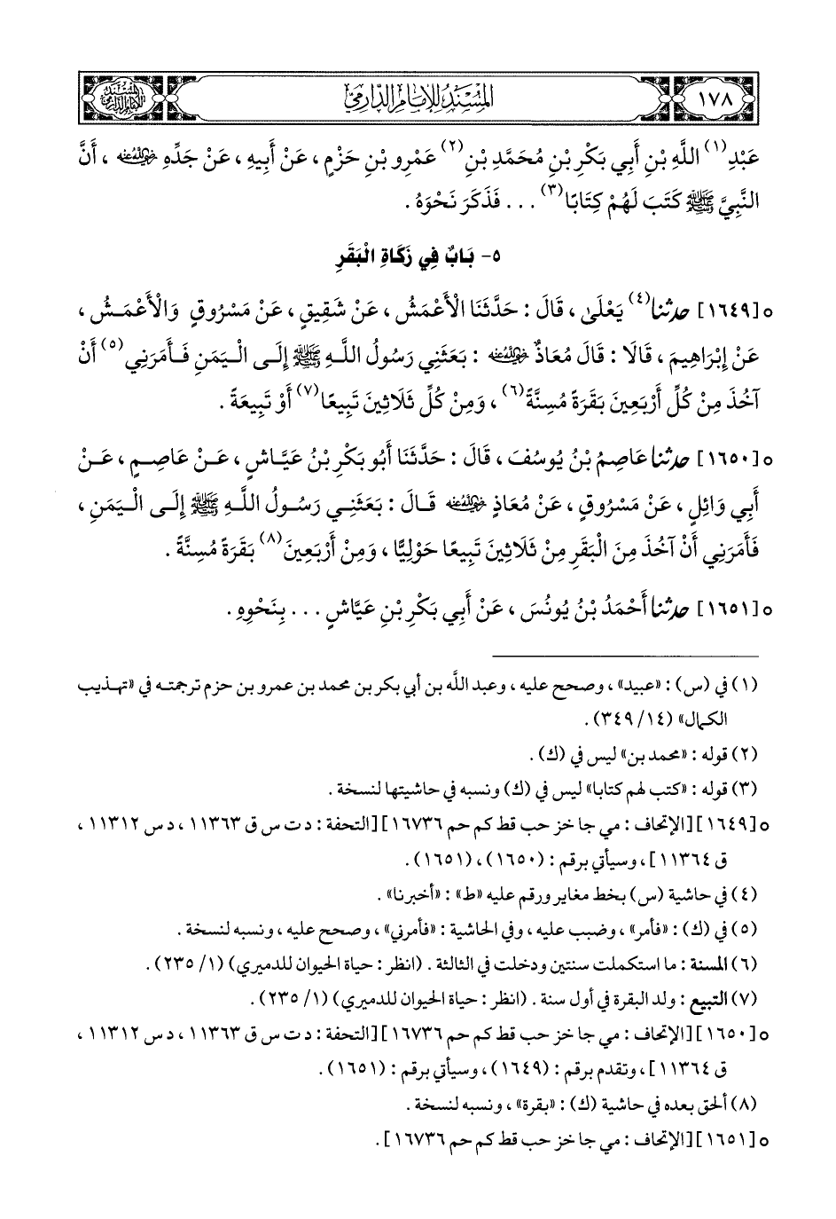 1650- حَدَّثَنَا عَاصِمُ بْنُ يُوسُفَ, قَالَ: حَدَّثَنَا أَبُو بَكْرِ بْنُ عَيَّاشٍ, عَنْ عَاصِمٍ, عَنْ أَبِي وَائِلٍ, عَنْ مَسْرُوقٍ, عَنْ مُعَاذٍ رَضِيَ اللهُ عَنْهُ, قَالَ: بَعَثَنِي رَسُولُ اللهِ صَلى الله عَليهِ وسَلم إِلَى الْيَمَنِ, فَأَمَرَنِي أَنْ آخُذَ مِنَ الْبَقَرِ مِنْ ثَلاَثِينَ تَبِيعًا حَوْلِيًّا, وَمِنْ أَرْبَعِينَ بَقَرَةً (1) مُسِنَّةً.