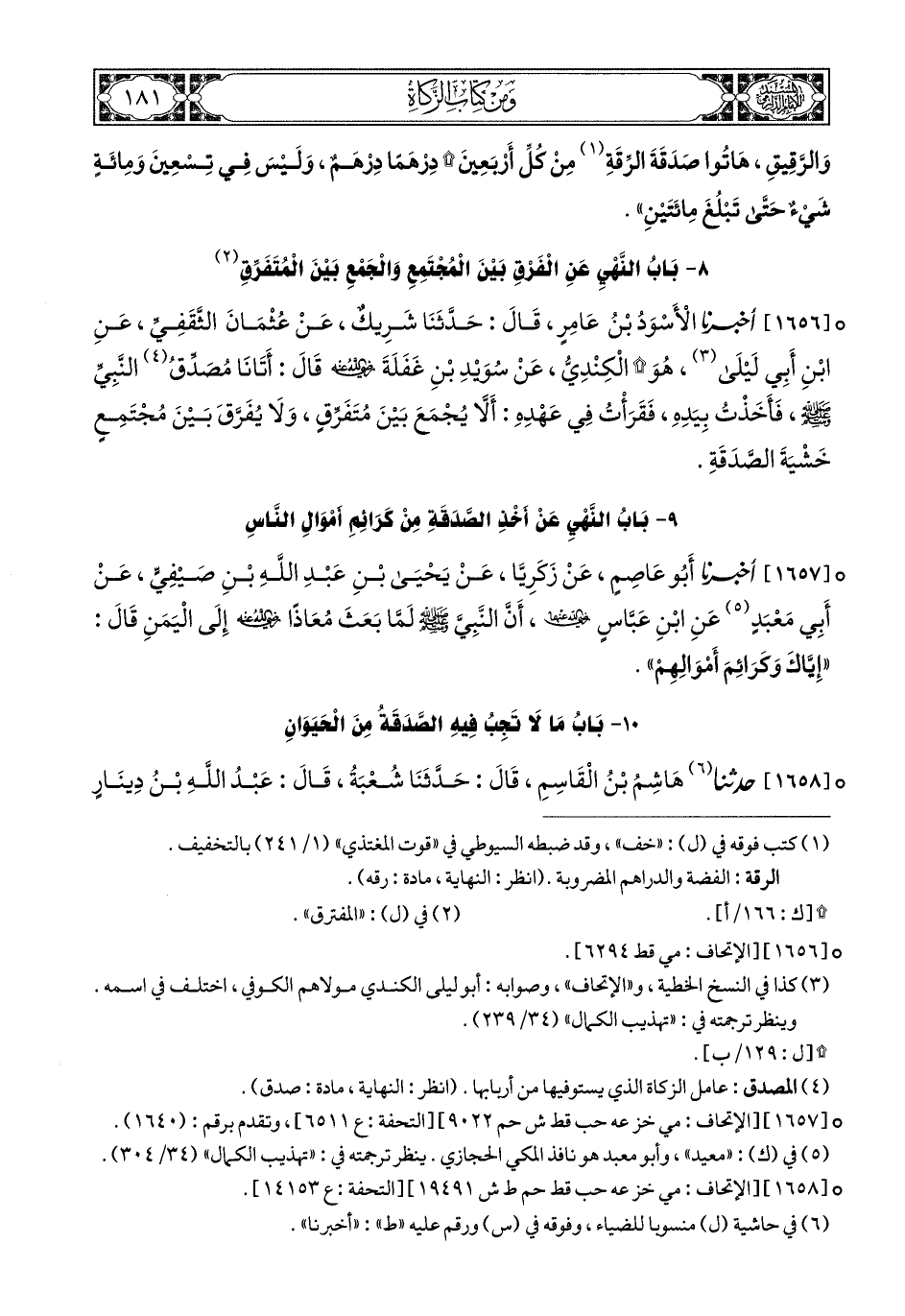 1656- أَخبَرَنا الأَسْوَدُ بْنُ عَامِرٍ, قَالَ: حَدَّثَنَا شَرِيكٌ, عَنْ عُثْمَانَ الثَّقَفِيِّ, عَنِ ابْنِ أَبِي لَيْلَى (2), هُوَ الْكِنْدِيِّ, عَنْ سُوَيْدِ بْنِ غَفَلَةَ رَضِيَ اللهُ عَنْهُ, قَالَ: أَتَانَا مُصَدِّقُ النَّبِيِّ صَلى الله عَليهِ وسَلم, فَأَخَذْتُ بِيَدِهِ, فَقَرَأْتُ فِي عَهْدِهِ أَلاَّ (3) يُجْمَعَ بَيْنَ مُتَفَرِّقٍ, وَلاَ يُفَرَّقَ بَيْنَ مُجْتَمِعٍ, خَشْيَةَ الصَّدَقَةِ.