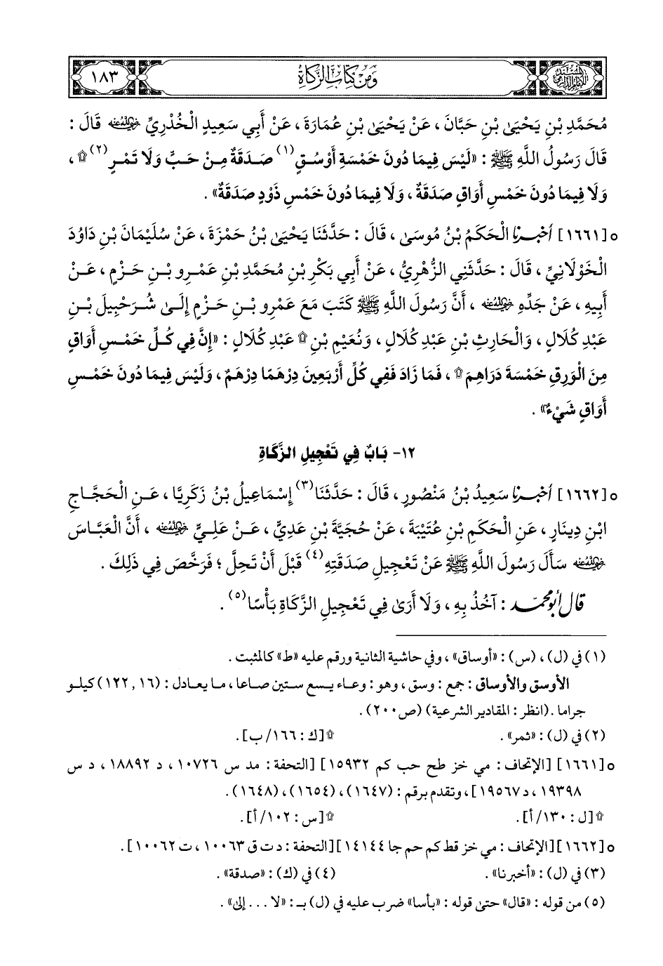 1662- أَخبَرَنا سَعِيدُ بْنُ مَنْصُورٍ, قَالَ: حَدَّثَنَا إِسْمَاعِيلُ بْنُ زَكَرَيَّا, عَنِ الْحَجَّاجِ بْنِ دِينَارٍ, عَنِ الْحَكَمِ بْنِ عُتَيْبَةَ, عَنْ حُجَيَّةَ بْنِ عَدِيٍّ, عَنْ عَلِيٍّ رَضِيَ اللهُ عَنْهُ أَنَّ الْعَبَّاسَ رَضِيَ اللهُ عَنْهُ سَأَلَ رَسُولَ اللهِ صَلى الله عَليهِ وسَلم عَنْ تَعْجِيلِ صَدَقَتِهِ قَبْلَ أَنْ تَحِلَّ, فَرَخَّصَ (1) فِي ذَلِكَ.