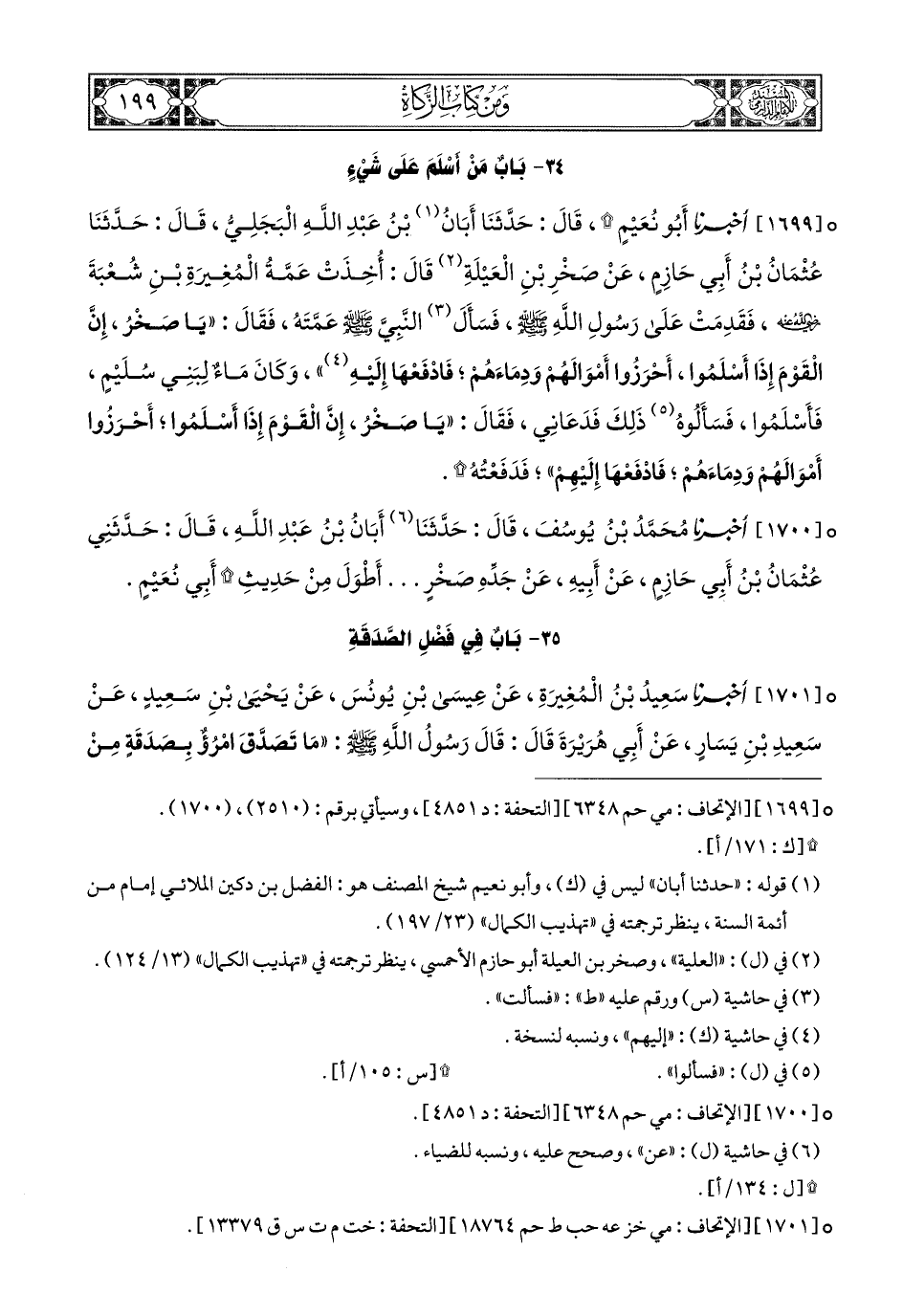 1699- أَخبَرَنا أَبُو نُعَيْمٍ, قَالَ: حَدَّثَنَا أَبَانُ بْنُ عَبْدِ اللهِ الْبَجَلِيُّ, قَالَ: حَدَّثَنَا عُثْمَانُ بْنُ أَبِي حَازِمٍ, عَنْ صَخْرِ بْنِ الْعَيْلَةِ, قَالَ: أُخِذَتْ عَمَّةُ الْمُغِيرَةِ بْنِ شُعْبَةَ رَضِيَ اللهُ عَنْهُ, فَقَدِمْتُ (1) عَلَى رَسُولِ اللهِ صَلى الله عَليهِ وسَلم, فَسَأَلَ النَّبِيَّ صَلى الله عَليهِ وسَلم عَمَّتَهُ, فَقَالَ: يَا صَخْرُ, إِنَّ الْقَوْمَ إِذَا أَسْلَمُوا أَحْرَزُوا أَمْوَالَهُمْ وَدِمَاءَهُمْ, فَادْفَعْهَا إِلَيْهِ, وَكَانَ مَاءٌ لِبَنِي سُلَيْمٍ فَأَسْلَمُوا, فَسَأَلُوهُ ذَلِكَ فَدَعَانِي, فَقَالَ: يَا صَخْرُ, إِنَّ الْقَوْمَ إِذَا أَسْلَمُوا أَحْرَزُوا أَمْوَالَهُمْ وَدِمَاءَهُمْ, فَادْفَعْهَا إِلَيْهِمْ فَدَفَعْتُهُ.