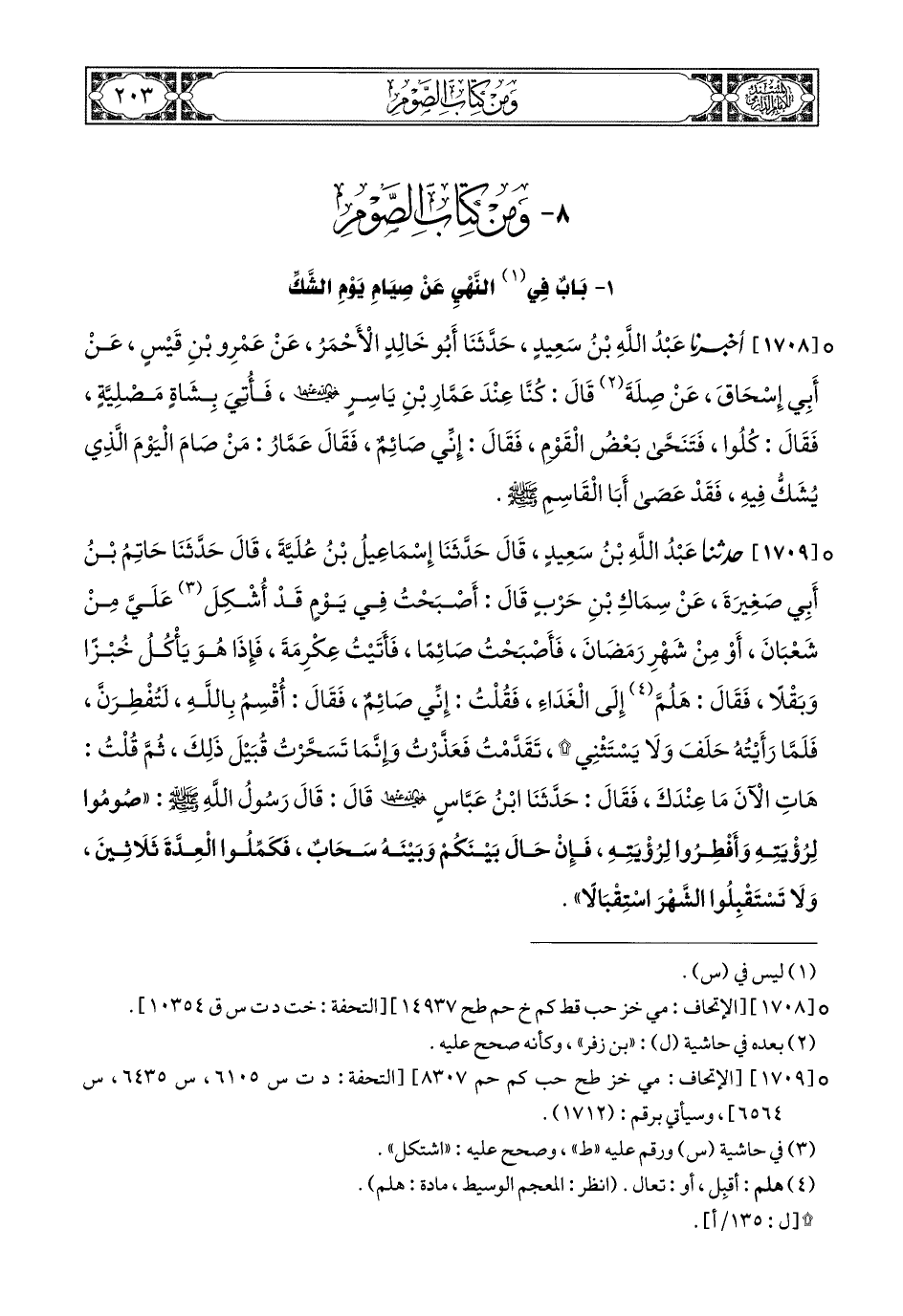 1709- حَدَّثَنَا عَبْدُ اللهِ بْنُ سَعِيدٍ, قَالَ: حَدَّثَنَا إِسْمَاعِيلُ ابْنُ عُلَيَّةَ, قَالَ: حَدَّثَنَا حَاتِمُ بْنُ أَبِي صَغِيرَةَ, عَنْ سِمَاكِ بْنِ حَرْبٍ, قَالَ: أَصْبَحْتُ فِي يَوْمٍ قَدْ أُشْكِلَ عَلَيَّ مِنْ شَعْبَانَ, أَوْ مِنْ شَهْرِ رَمَضَانَ, فَأَصْبَحْتُ صَائِمًا, فَأَتَيْتُ عِكْرِمَةَ, فَإِذَا هُوَ يَأْكُلُ خُبْزًا وَبَقْلًا, فَقَالَ: هَلُمَّ إِلَى الْغَدَاءِ, فَقُلْتُ: إِنِّي صَائِمٌ, فَقَالَ: أُقْسِمُ بِاللهِ لَتُفْطِرَنَّ, فَلَمَّا رَأَيْتُهُ حَلَفَ, وَلاَ يَسْتَثْنِي, تَقَدَّمْتُ فَعَذَّرْتُ (1), وَإِنَّمَا تَسَحَّرْتُ قُبَيْلَ ذَلِكَ, ثُمَّ قُلْتُ: هَاتِ الآنَ مَا عِنْدَكَ, فَقَالَ: حَدَّثَنَا ابْنُ عَبَّاسٍ رَضِيَ اللهُ عَنْهُمَا, قَالَ: قَالَ رَسُولُ اللهِ صَلى الله عَليهِ وسَلم: صُومُوا لِرُؤْيَتِهِ, وَأَفْطِرُوا لِرُؤْيَتِهِ, فَإِنْ حَالَ بَيْنَكُمْ وَبَيْنَهُ سَحَابٌ فَكَمِّلُوا الْعِدَّةَ ثَلاَثِينَ, وَلاَ تَسْتَقْبِلُوا الشَّهْرَ اسْتِقْبَالاً.