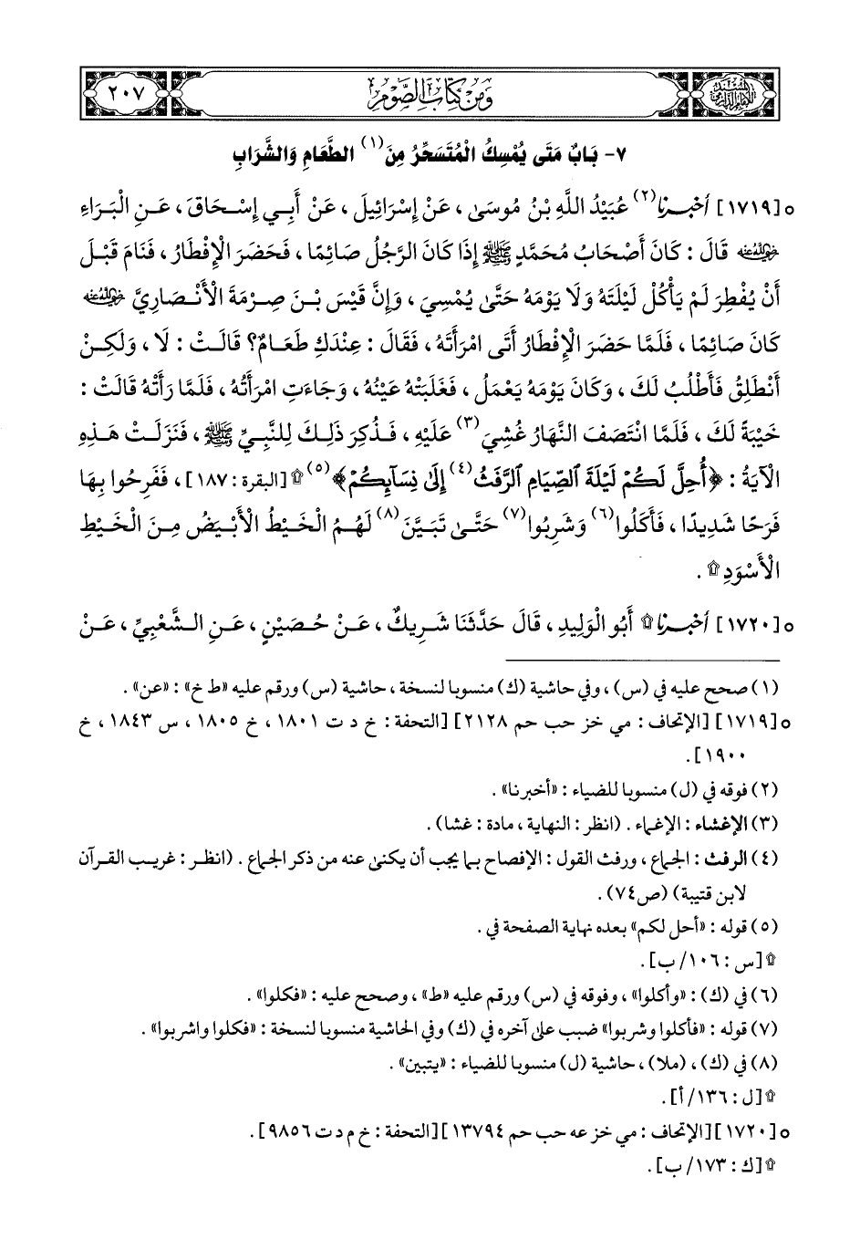 1719- أَخبَرَنا عُبَيْدُ اللهِ بْنُ مُوسَى, عَنْ إِسْرَائِيلَ, عَنْ أَبِي إِسْحَاقَ, عَنِ الْبَرَاءِ رَضِيَ اللهُ عَنْهُ, قَالَ: كَانَ أَصْحَابُ مُحَمَّدٍ صَلى الله عَليهِ وسَلم إِذَا كَانَ الرَّجُلُ صَائِمًا فَحَضَرَ الإِفْطَارُ, فَنَامَ قَبْلَ أَنْ يُفْطِرَ لَمْ يَأْكُلْ لَيْلَتَهُ, وَلاَ يَوْمَهُ, حَتَّى يُمْسِيَ, وَإِنَّ قَيْسَ بْنَ صِرْمَةَ الأَنْصَارِيَّ رَضِيَ اللهُ عَنْهُ كَانَ صَائِمًا, فَلَمَّا حَضَرَ الإِفْطَارُ أَتَى امْرَأَتَهُ, فَقَالَ: عِنْدَكِ طَعَامٌ؟ قَالَتْ: لاَ, وَلَكِنْ أَنْطَلِقُ فَأَطْلُبُ لَكَ, وَكَانَ يَوْمَهُ يَعْمَلُ, فَغَلَبَتْهُ عَيْنُهُ, وَجَاءَتِ امْرَأَتُهُ, فَلَمَّا رَأَتْهُ قَالَتْ: خَيْبَةً لَكَ, فَلَمَّا انْتَصَفَ النَّهَارُ غُشِيَ عَلَيْهِ, فَذُكِرَ ذَلِكَ لِلنَّبِيِّ صَلى الله عَليهِ وسَلم, فَنَزَلَتْ هَذِهِ الآيَةُ {أُحِلَّ لَكُمْ لَيْلَةَ الصِّيَامِ الرَّفَثُ إِلَى نِسَآئِكُمْ} (2) فَفَرِحُوا بِهَا فَرَحًا شَدِيدًا, فأَكُلُوا وَاشْرَبُوا حَتَّى تَبَيَّنَ لَهُمُ الْخَيْطُ الأَبْيَضُ مِنَ الْخَيْطِ الأَسْوَدِ (3).