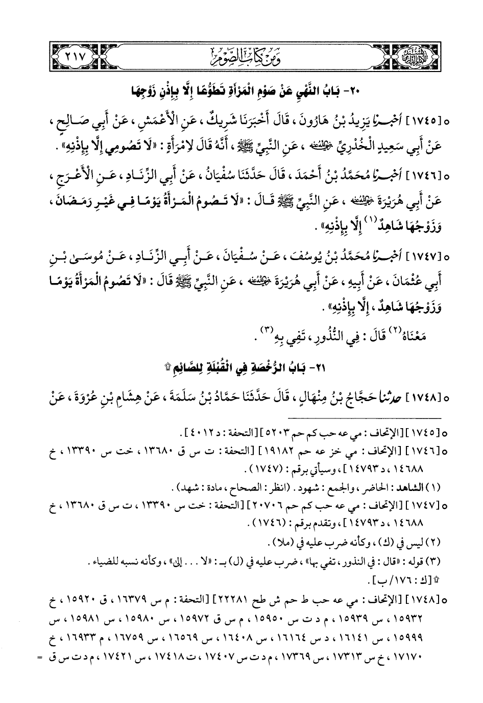 1745- أَخبَرَنا يَزِيدُ بْنُ هَارُونَ, قَالَ: أَخبَرَنا شَرِيكٌ, عَنِ الأَعْمَشِ, عَنْ أَبِي صَالِحٍ, عَنْ أَبِي سَعِيدٍ الْخُدْرِيِّ رَضِيَ اللهُ عَنْهُ, عَنِ النَّبِيِّ صَلى الله عَليهِ وسَلم أَنَّهُ قَالَ لاِمْرَأَةٍ: لاَ تَصُومِي إِلاَّ بِإِذْنِهِ.