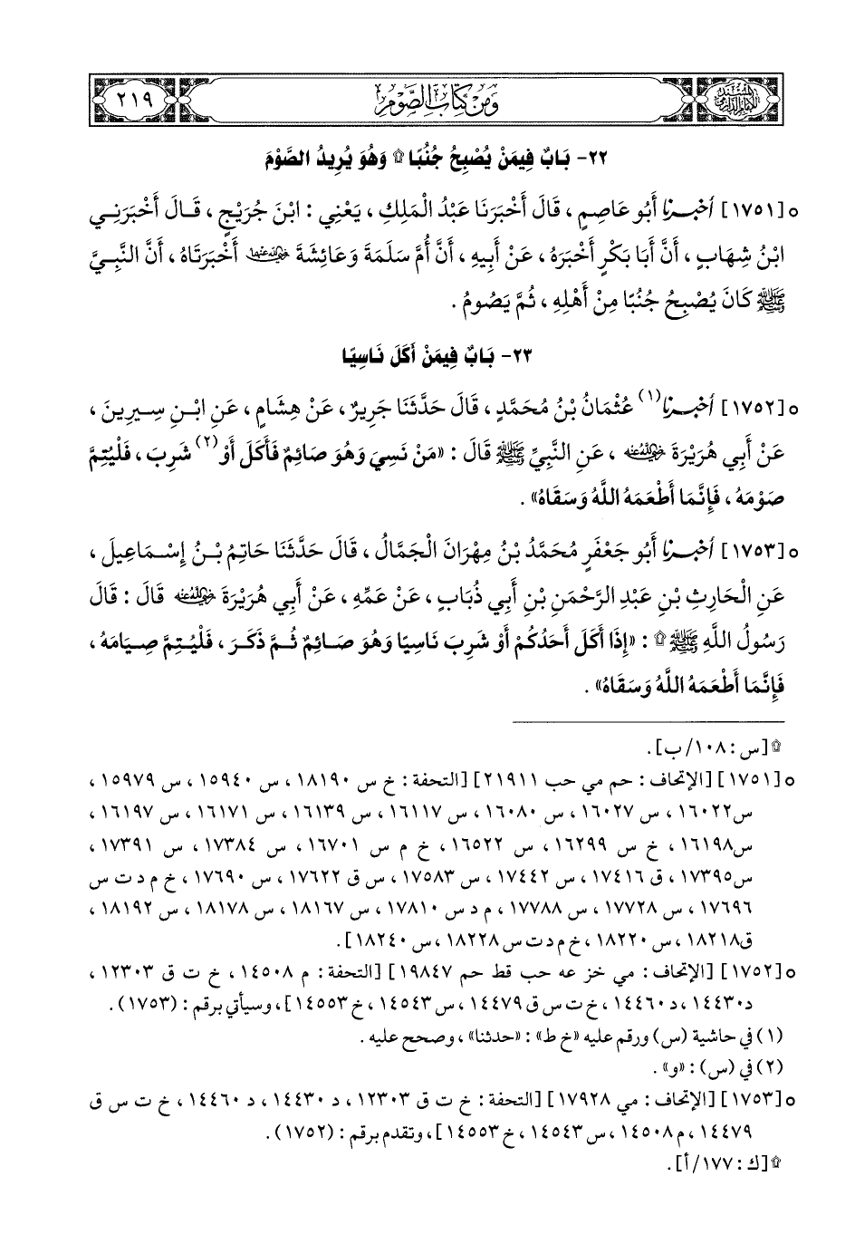 1752- أَخبَرَنا عُثْمَانُ بْنُ مُحَمَّدٍ, قَالَ: حَدَّثَنَا جَرِيرٌ, عَنْ هِشَامِ (1), عَنِ ابْنِ سِيرِينَ, عَنْ أَبِي هُرَيْرَةَ رَضِيَ اللهُ عَنْهُ, عَنِ النَّبِيِّ صَلى الله عَليهِ وسَلم, قَالَ: مَنْ نَسِيَ وَهُوَ صَائِمٌ, فَأَكَلَ أَوْ شَرِبَ فَلْيُتِمَّ صَوْمَهُ, فَإِنَّمَا أَطْعَمَهُ اللهُ وَسَقَاهُ.