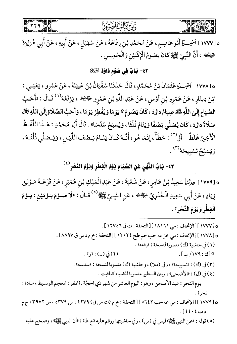 1777- أَخبَرَنا أَبُو عَاصِمٍ, عَنْ مُحَمَّدِ بْنِ رِفَاعَةَ, عَنْ سُهَيْلٍ, عَنْ أَبِيهِ, عَنْ أَبِي هُرَيْرَةَ رَضِيَ اللهُ عَنْهُ, أَنَّ النَّبِيَّ صَلى الله عَليهِ وسَلم كَانَ يَصُومُ الاِثْنَيْنِ وَالْخَمِيسِ (1).