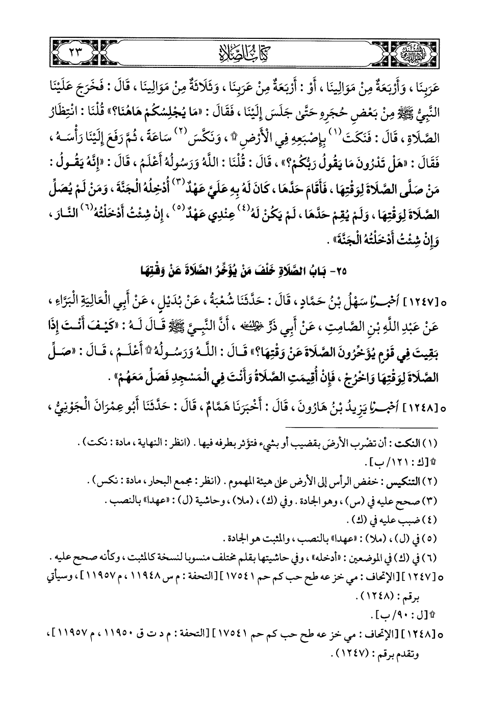 1247- أَخبَرَنا سَهْلُ بْنُ حَمَّادٍ, قَالَ: حَدَّثَنَا شُعْبَةُ, عَنْ بُدَيْلٍ, عَنْ أَبِي الْعَالِيَةِ الْبَرَّاءِ, عَنْ عَبْدِ اللهِ بْنِ الصَّامِتِ, عَنْ أَبِي ذَرٍّ رَضِيَ اللهُ عَنْهُ, أَنَّ النَّبِيَّ صَلى الله عَليهِ وسَلم قَالَ لَهُ: كَيْفَ أَنْتَ إِذَا بَقِيتَ فِي قَوْمٍ يُؤَخِّرُونَ الصَّلاَةَ عَنْ وَقْتِهَا؟ قَالَ: اللهُ وَرَسُولُهُ أَعْلَمُ, قَالَ: صَلِّ الصَّلاَةَ لِوَقْتِهَا وَاخْرُجْ, فَإِنْ أُقِيمَتِ الصَّلاَةُ وَأَنْتَ فِي الْمَسْجِدِ فَصَلِّ مَعَهُمْ.