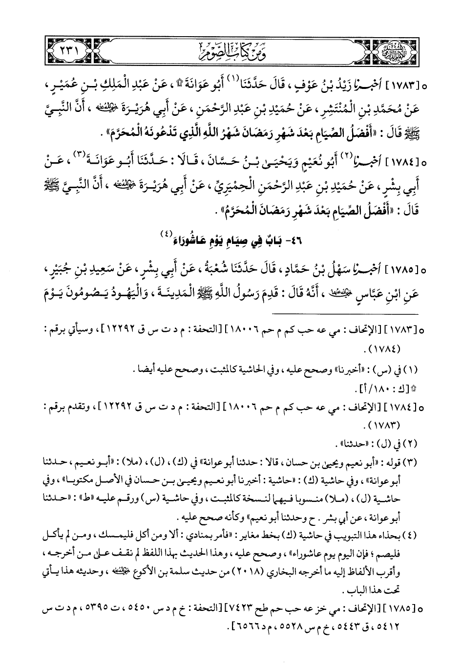 1783- أَخبَرَنا زَيْدُ بْنُ عَوْفٍ, قَالَ: حَدَّثَنَا أَبُو عَوَانَةَ, عَنْ عَبْدِ الْمَلِكِ بْنِ عُمَيْرٍ, عَنْ مُحَمَّدِ بْنِ الْمُنْتَشِرِ, عَنْ حُمَيْدِ بْنِ عَبْدِ الرَّحْمَنِ, عَنْ أَبِي هُرَيْرَةَ رَضِيَ اللهُ عَنْهُ, أَنَّ النَّبِيَّ صَلى الله عَليهِ وسَلم قَالَ: أَفْضَلُ الصِّيَامِ بَعْدَ شَهْرِ رَمَضَانَ شَهْرُ اللهِ الَّذِي تَدْعُونَهُ الْمُحَرَّمَ.