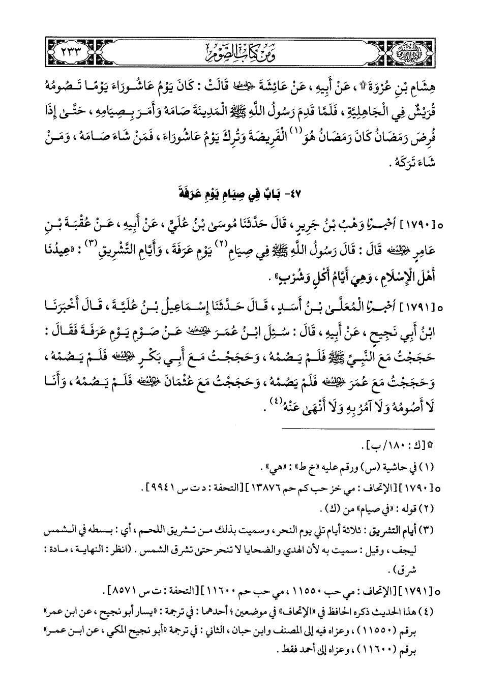 1790- أَخبَرَنا وَهْبُ بْنُ جَرِيرٍ, قَالَ: حَدَّثَنَا مُوسَى بْنُ عُلَيٍّ, عَنْ أَبِيهِ, عَنْ عُقْبَةَ بْنِ عَامِرٍ رَضِيَ اللهُ عَنْهُ, قَالَ: قَالَ رَسُولُ اللهِ صَلى الله عَليهِ وسَلم فِي صِيَامِ (1) يَوْمِ عَرَفَةَ, وَأَيَّامُ التَّشْرِيقِ: عِيدُنَا أَهْلَ الإِسْلاَمِ, وَهِيَ أَيَّامُ أَكْلٍ وَشُرْبٍ.