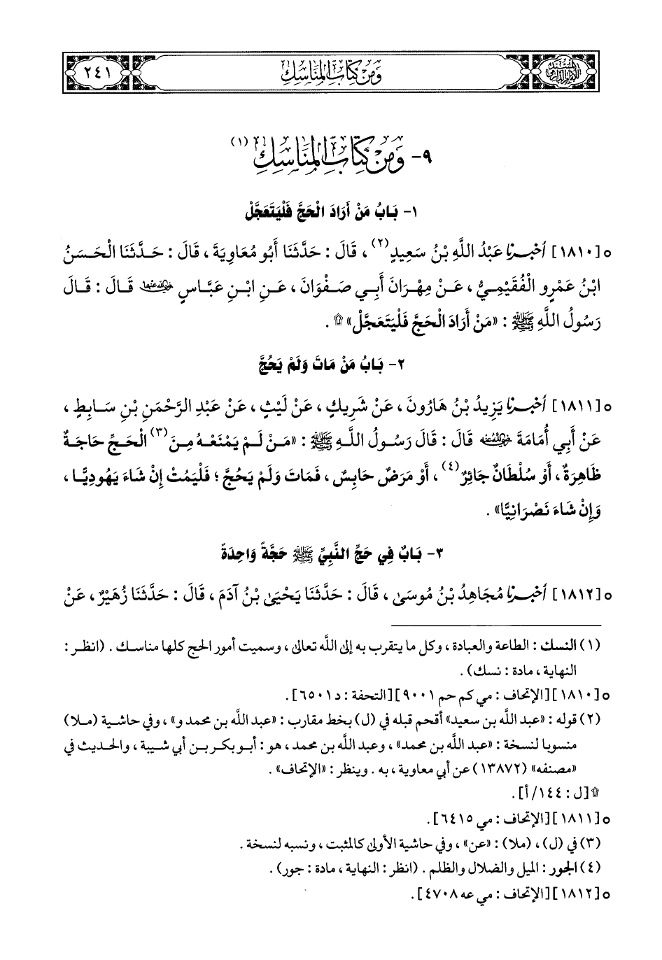 1811- أَخبَرَنا يَزِيدُ بْنُ هَارُونَ, عَنْ شَرِيكٍ, عَنْ لَيْثٍ, عَنْ عَبْدِ الرَّحْمَنِ بْنِ سَابِطٍ, عَنْ أَبِي أُمَامَةَ رَضِيَ اللهُ عَنْهُ, قَالَ: قَالَ رَسُولُ اللهِ صَلى الله عَليهِ وسَلم: مَنْ لَمْ يَمْنَعْهُ (1) مِنَ الْحَجِّ (2) حَاجَةٌ ظَاهِرَةٌ, أَوْ سُلْطَانٌ جَائِرٌ, أَوْ مَرَضٌ حَابِسٌ, فَمَاتَ وَلَمْ يَحُجَّ, فَلْيَمُتْ إِنْ شَاءَ يَهُودِيًّا, وَإِنْ شَاءَ نَصْرَانِيًّا.