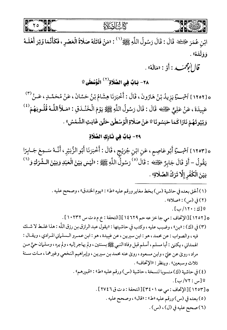 1252- أَخبَرَنا يَزِيدُ بْنُ هَارُونَ, قَالَ: أَخبَرَنا هِشَامُ بْنُ حَسَّانَ, عَنْ مُحَمَّدٍ, عَنْ عَبِيدَةَ, عَنْ عَلِيٍّ رَضِيَ اللهُ عَنْهُ, قَالَ: قَالَ رَسُولُ اللهِ صَلى الله عَليهِ وسَلم يَوْمَ الْخَنْدَقِ: مَلأَ اللهُ قُلُوبَهُمْ (1) وَبُيُوتَهُمْ نَارًا كَمَا حَبَسُونَا عَنْ صَلاَةِ الْوُسْطَى, حَتَّى غَابَتِ الشَّمْسُ.