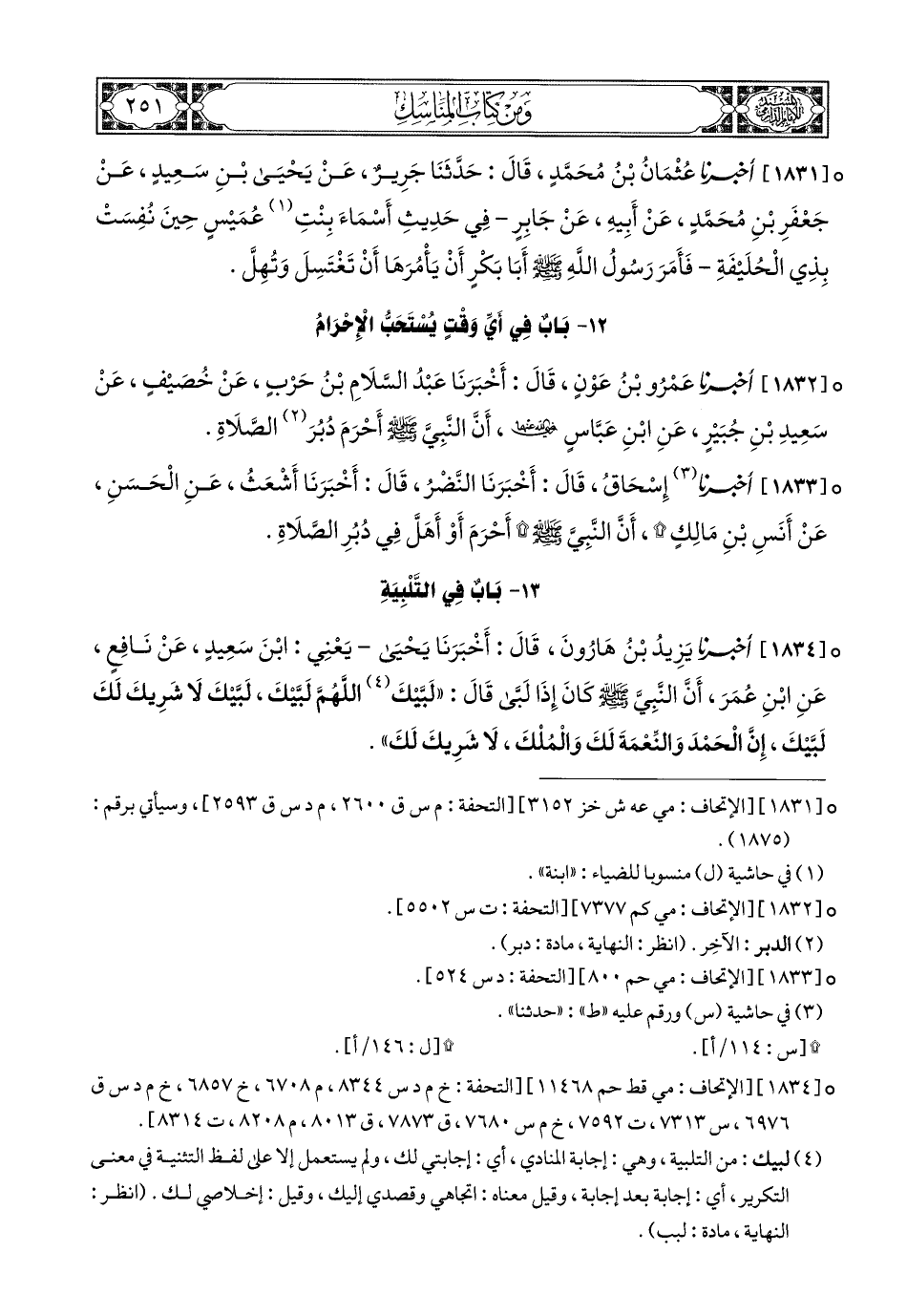 1832- أَخبَرَنا عَمْرُو بْنُ عَوْنٍ, قَالَ: أَخبَرَنا عَبْدُ السَّلاَمِ بْنُ حَرْبٍ, عَنْ خُصَيْفٍ, عَنْ سَعِيدِ بْنِ جُبَيْرٍ, عَنِ ابْنِ عَبَّاسٍ رَضِيَ اللهُ عَنْهُمَا, أَنَّ النَّبِيَّ صَلى الله عَليهِ وسَلم أَحْرَمَ دُبُرَ الصَّلاَةِ.
