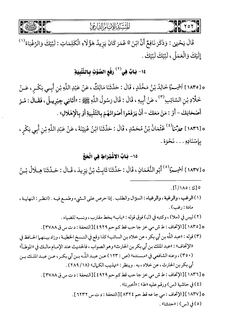 (1) كذا في طبعة دار التأصيل, وأفاد محققوها أنه كذلك في النُّسَخ الخطية, وفي طبعة دار البشائر زاد المحقق بين عبد الله بن أبي بكر, وخلاد بن السائب "عبد الملك بن أبي بكر" وقال في الحاشية: سقط من جميع الأصول, نبهنا عليه قديمًا في الشرح, وأثبته في الإسناد الحافظ في الإتحاف, استفاده بعضهم منا فزاد في نسبه: ابن الحارث, وهي عادة درج عليها لإبعاد شبهة الاقتباس.