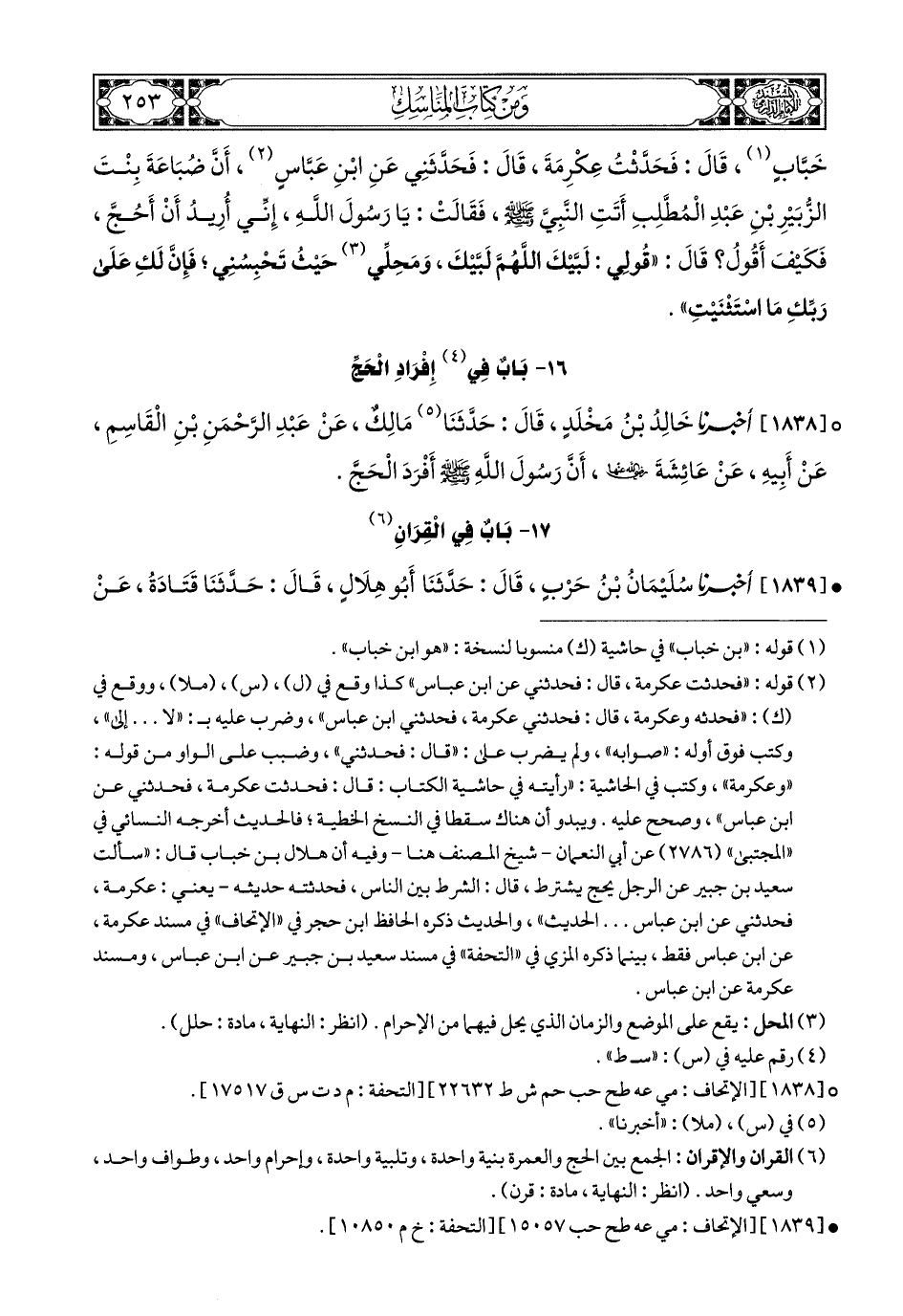 1838- أَخبَرَنا خَالِدُ بْنُ مَخْلَدٍ, قَالَ: حَدَّثَنَا مَالِكٌ, عَنْ عَبْدِ الرَّحْمَنِ بْنِ الْقَاسِمِ, عَنْ أَبِيهِ, عَنْ عَائِشَةَ رَضِيَ اللهُ عَنْهَا, أَنَّ رَسُولَ اللهِ صَلى الله عَليهِ وسَلم أَفْرَدَ الْحَجَّ.