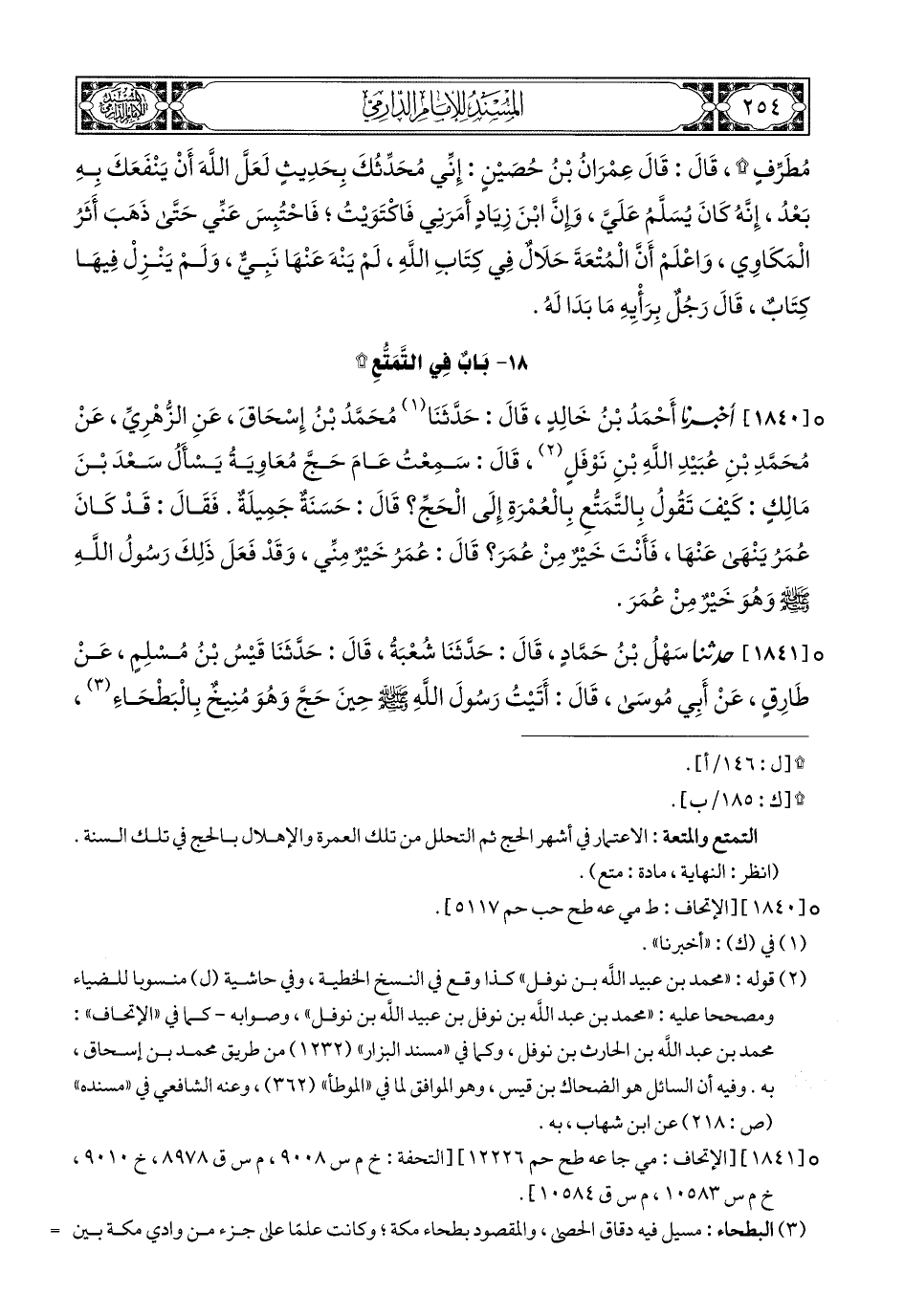 1841 - حَدَّثَنَا سَهْلُ بْنُ حَمَّادٍ, قَالَ: حَدَّثَنَا شُعْبَةُ, قَالَ: حَدَّثَنَا قَيْسُ بْنُ مُسْلِمٍ, عَنْ طَارِقٍ, عَنْ أَبِي مُوسَى, قَالَ: أَتَيْتُ رَسُولَ اللهِ صَلى الله عَليهِ وسَلم حِينَ حَجَّ, وَهُوَ مُنِيخٌ بِالْبَطْحَاءِ, فَقَالَ لِي: أَحَجَجْتَ؟ قُلْتُ: نَعَمْ, قَالَ: كَيْفَ أَهْلَلْتَ؟ قَالَ: قُلْتُ: لَبَّيْكَ بِإِهْلاَلٍ كَإِهْلاَلِ النَّبِيِّ صَلى الله عَليهِ وسَلم, قَالَ: أَحْسَنْتَ, اذْهَبْ فَطُفْ بِالْبَيْتِ, وَبِالصَّفَا وَالْمَرْوَةِ, ثُمَّ حِلَّ, قَالَ: فَطُفْتُ بِالْبَيْتِ, وَالصَّفَا وَالْمَرْوَةِ, ثُمَّ أَتَيْتُ امْرَأَةً مِنْ نِسَاءِ بَنِي قَيْسٍ, فَجَعَلَتْ تَفْلِي رَأْسِي, فَجَعَلْتُ أُفْتِي النَّاسَ بِذَلِكَ, فَقَالَ لِي رَجُلٌ: يَا عَبْدَ اللهِ بْنَ قَيْسٍ, رُوَيْدًا بَعْضَ فُتْيَاكَ, فَإِنَّكَ لاَ تَدْرِي مَا أَحْدَثَ أَمِيرُ الْمُؤْمِنِينَ فِي النُّسُكِ بَعْدَكَ, فَقُلْتُ: يَا أَيُّهَا النَّاسُ, مَنْ كُنَّا أَفْتَيْنَاهُ فُتْيَا فَلْيَتَّئِدْ, فَإِنَّ أَمِيرَالْمُؤْمِنِينَ قَادِمٌ عَلَيْكُمْ, فَبِهِ فَأْتَمُّوا, فَلَمَّا قَدِمَ أَتَيْتُهُ, فَذَكَرْتُ ذَلِكَ لَهُ, فَقَالَ: إِنْ نَأْخُذْ بِكِتَابِ اللهِ, فَإِنَّ كِتَابَ اللهِ يَأْمُرُ بِالتَّمَامِ, وَإِنْ نَأْخُذْ بِسُنَّةِ رَسُولِ اللهِ صَلى الله عَليهِ وسَلم, فَإِنَّ رَسُولَ اللهِ صَلى الله عَليهِ وسَلم لَمْ يَحِلَّ, حَتَّى بَلَغَ الْهَدْيُ مَحِلَّهُ.